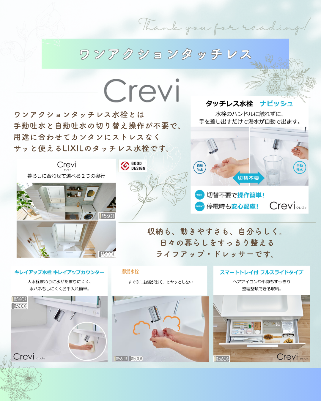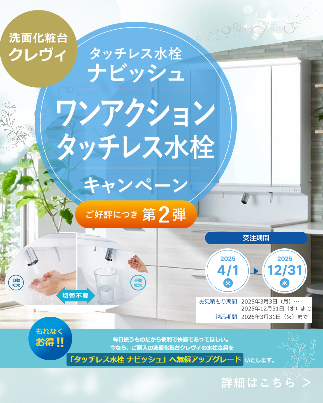 期間中に洗面化粧台「クレヴィ」をご購入いただくと、水栓金具をタッチレス水栓「ナビッシュ」へ無償アップグレード☆