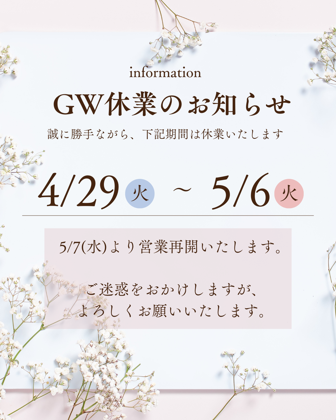 GW休業のお知らせです。