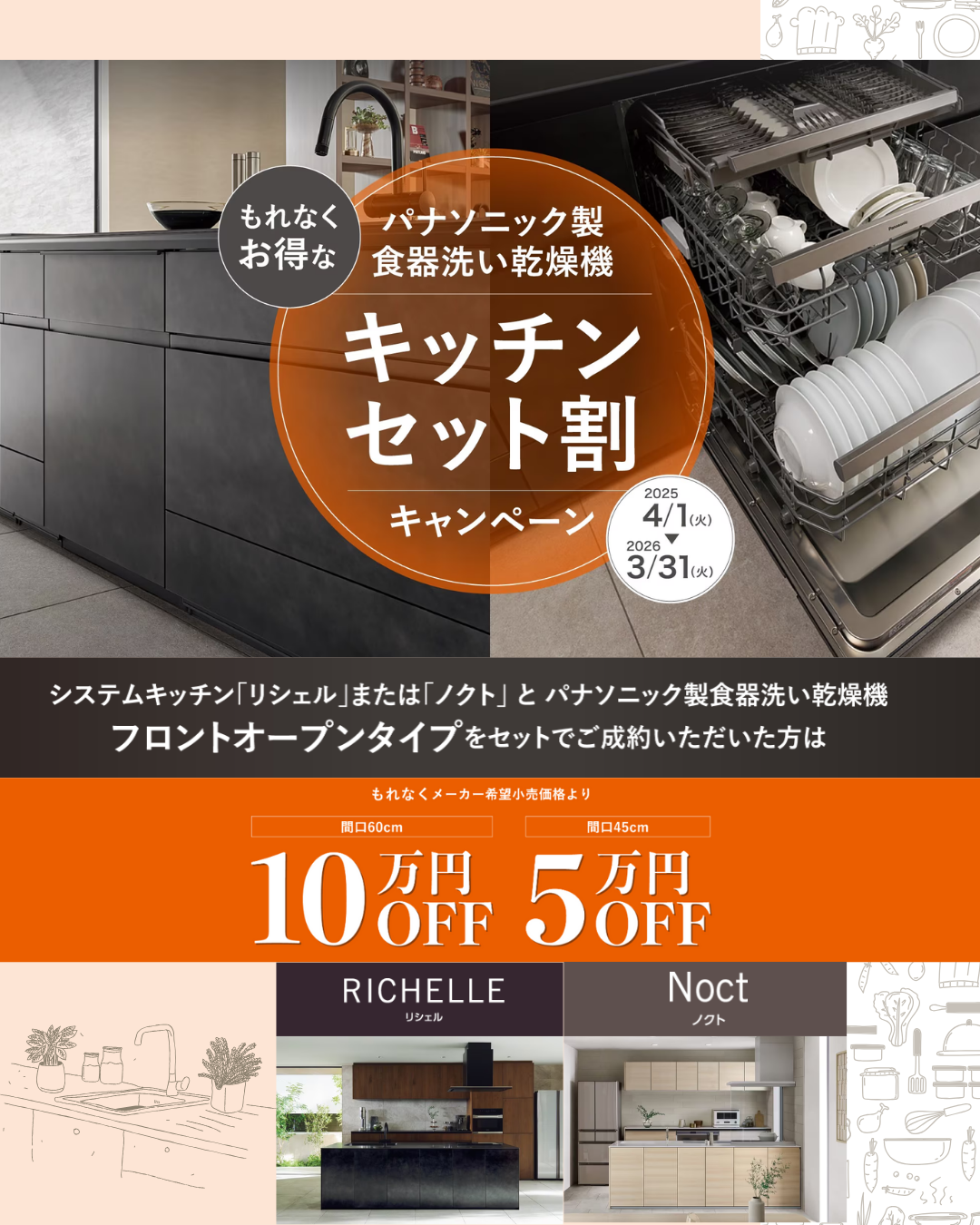 詳しくは"パナソニック製食器洗い乾燥機キッチンセット割キャンペーン"でご検索していただくか、キャンペーン対象店の当店までお問い合わせください。