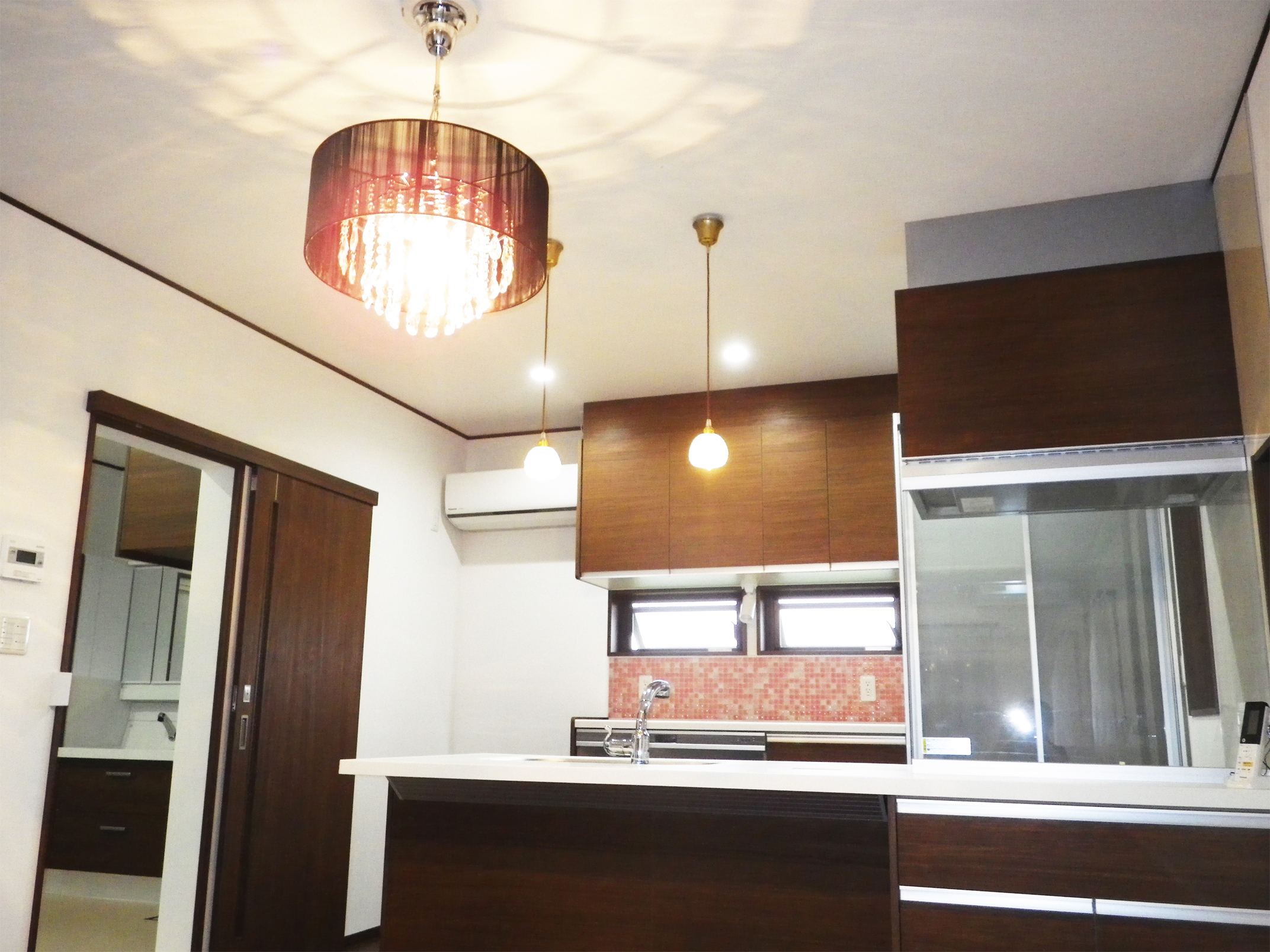 以前のキッチンは収納スペースが少なく、収納しきれないモノが多すぎて困っていましたが、大容量のカップボードを取り付けたことで解決しました。穏やかな光のシャンデリアと対面式のキッチンは、家族とのコミュニケーションを大切にする施主様ご家族のお気に入りとなっています。また、最愛の奥様が毎日楽しく料理を作れるようにという施主様の希望で、可愛いモザイクタイルを奥様と一緒に壁面に貼りました。愛着がわいていつまでもキレイに使っていただけるキッチンとなりました。