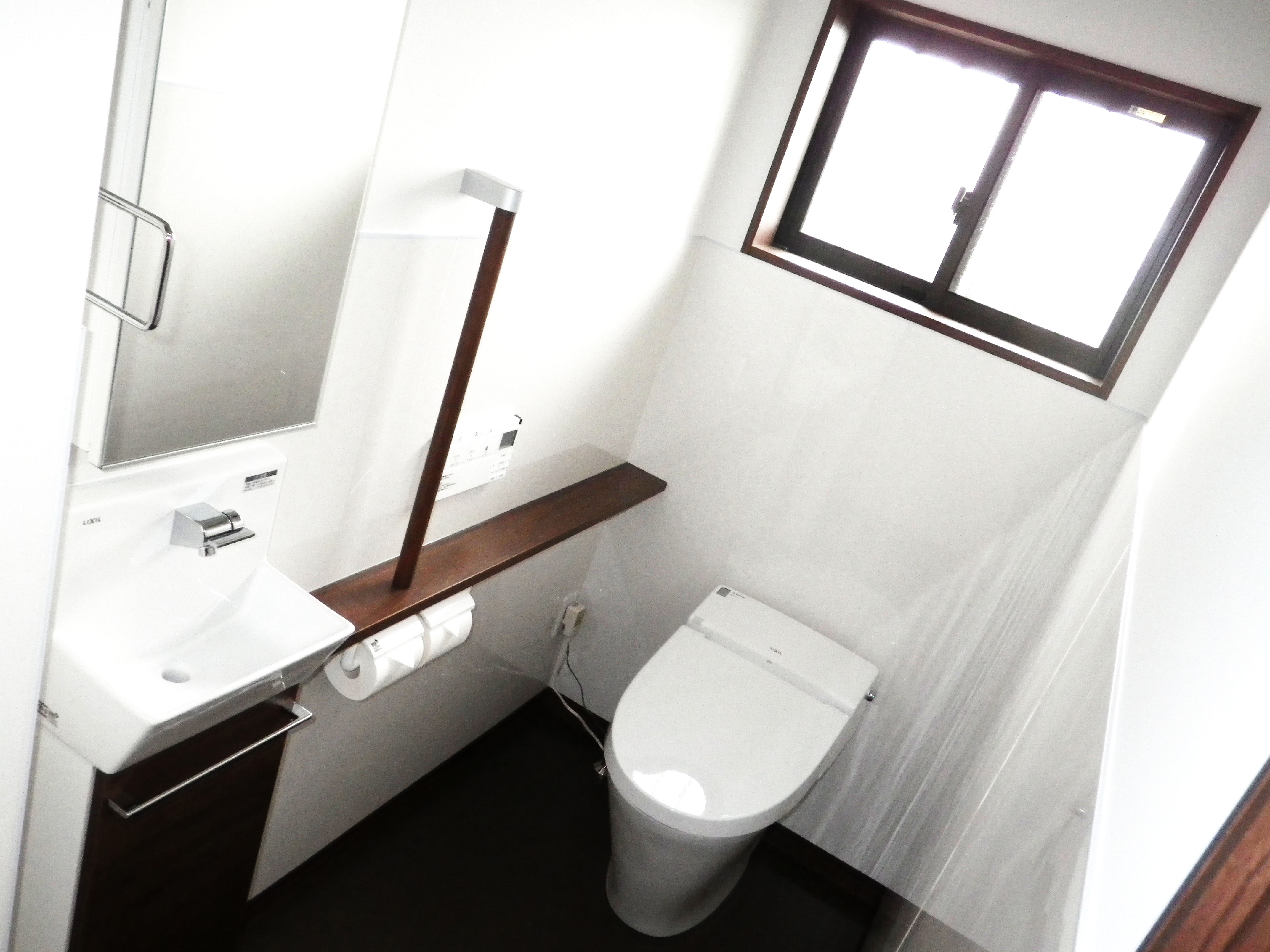 以前よりトイレ空間を縮小しましたが、タンクレストイレサティスを取り付けたのでトイレ空間が狭くなったことを感じさせません。腰壁に防水パネルを貼っているので、サッと拭くだけで汚れが取れるのでキレイが続きます。部屋の床フロアと同じ色に合わせたクッションフロアを貼ったので、トイレ空間にも統一感が出ています。
