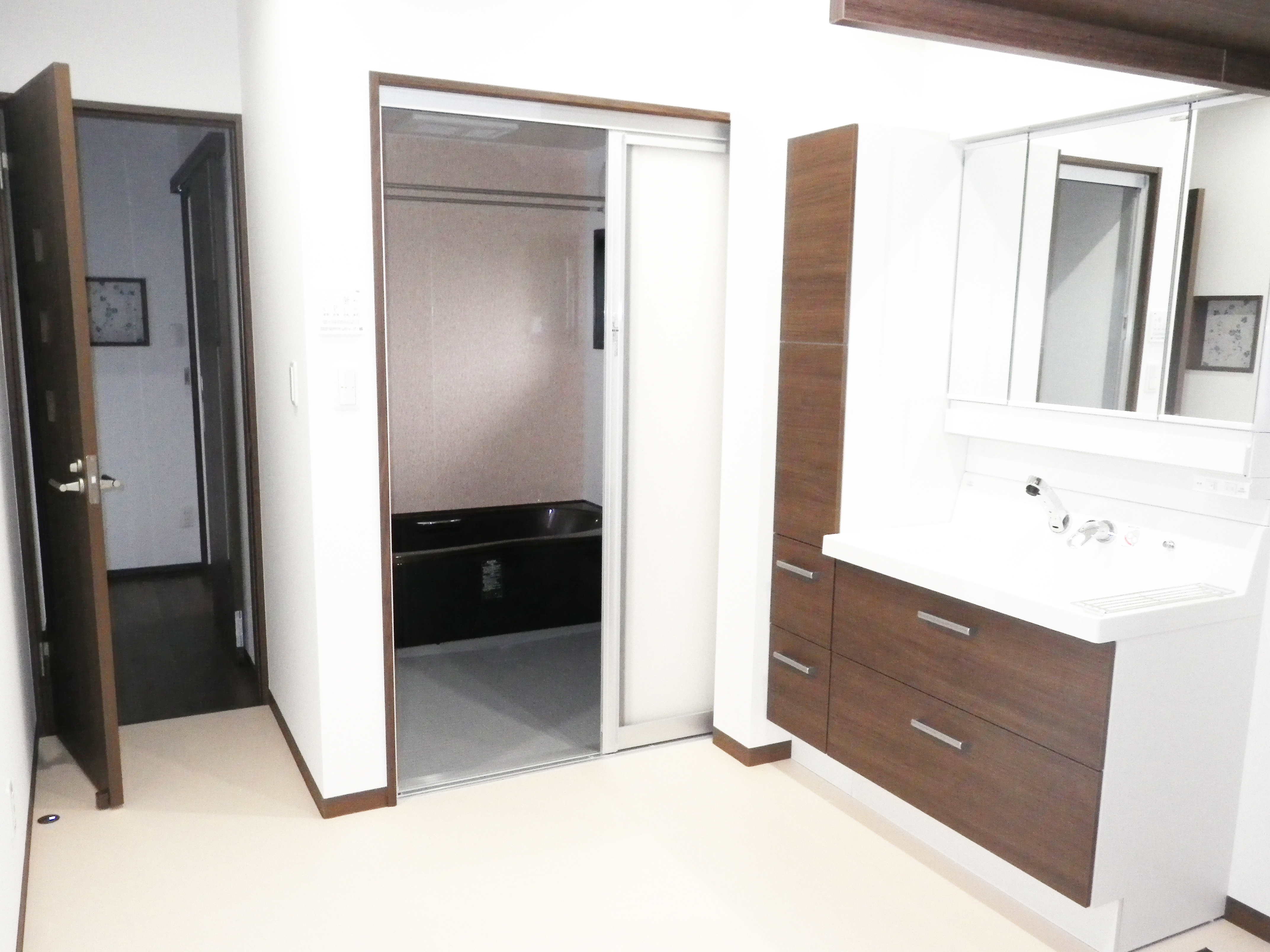 洗面化粧台周りは何かと物があふれるスペースですが、トールキャビネット、タスボックスなどの収納を取り付けることでゴチャゴチャしがちなユーティリティースペースがすっきりとしました。水ハネ汚れの少ない洗面化粧台はお掃除もラクラクで、奥様の味方となっています。