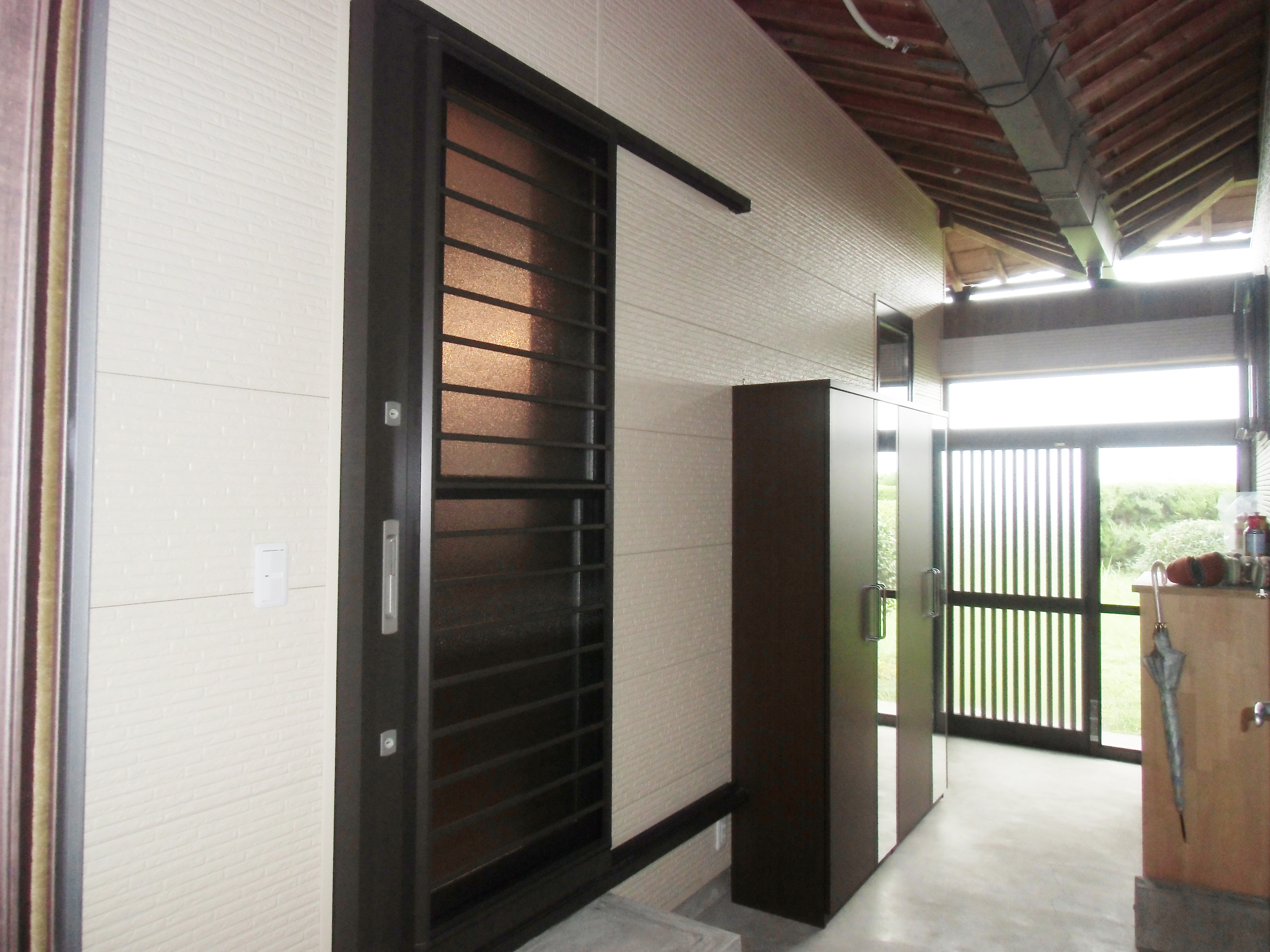 離れと隣り合う裏玄関となる場所ですが、通路幅を大きく取るために勝手口サッシを採用しました。採風タイプのスライドドアなので、新鮮な空気を取り込むことが出来、湿気のこもらない玄関となりました。