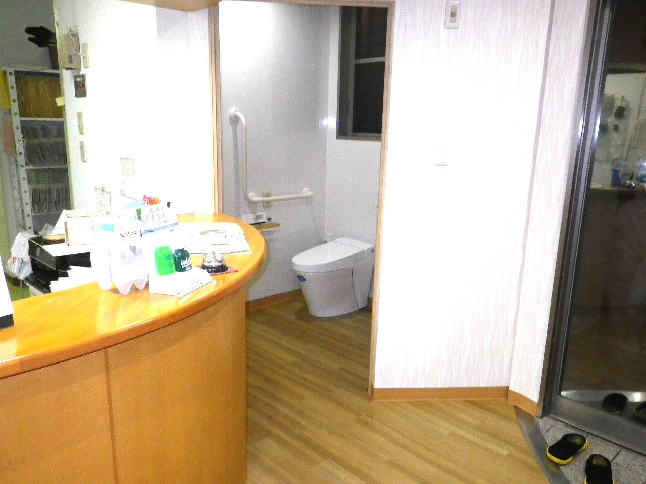 車いす対応のために広めに作ってあったトイレ。けれども入口横の土間に設置されているので、トイレに入るためにトイレ用スリッパに履き替えてもらわなければならなくて、車いすのかたも数ミリとはいえ一度スロープ段差を上り下りしてもらわなければならないのがネックでした。また、トイレの横に設置していた待合スペースは狭く、混んでいるときは座ってもらうことができなくて立ってもらうこともありました。