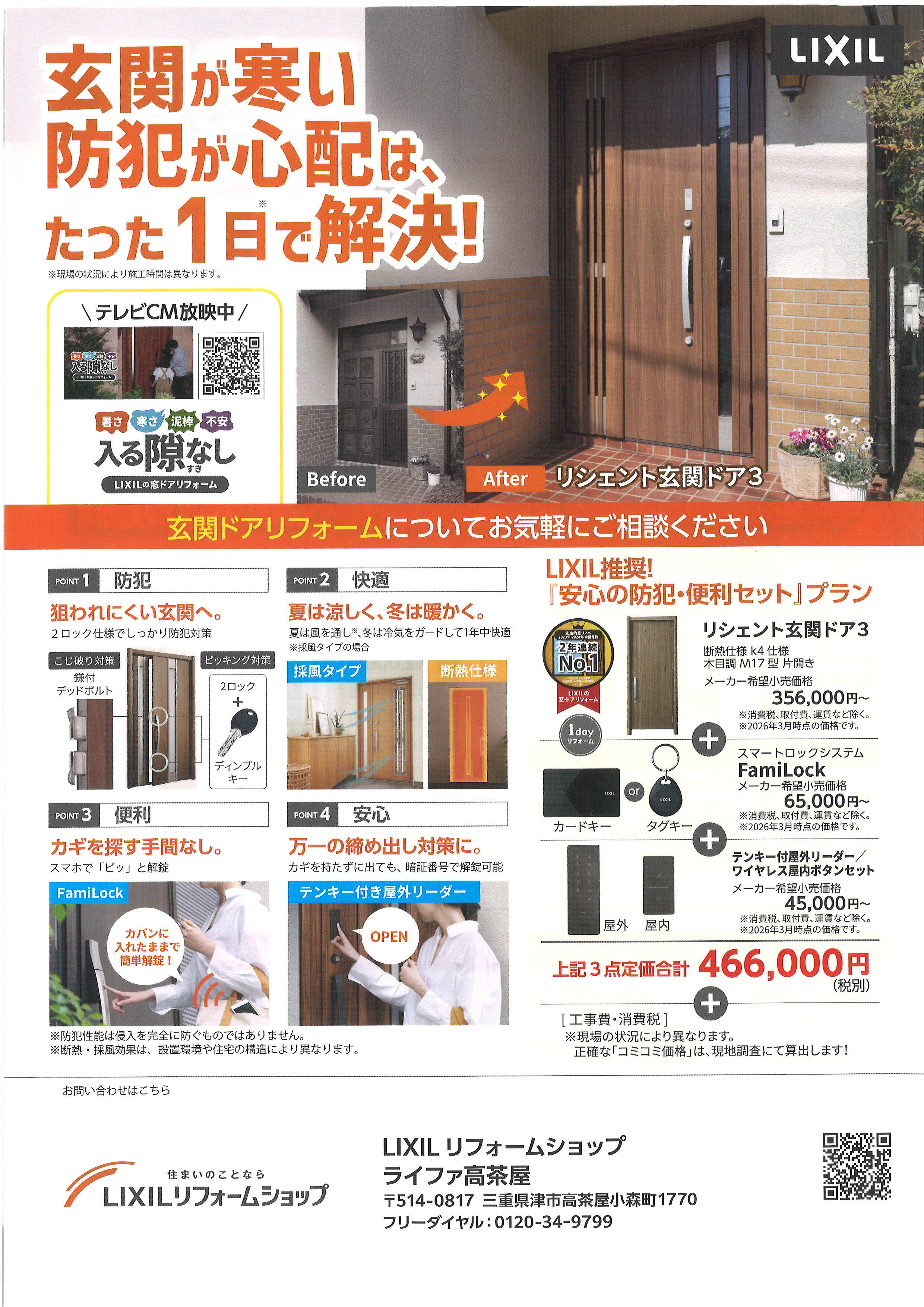 1日リフォームが可能な玄関ドア【リシェント】は防犯性に優れているので大人気です!