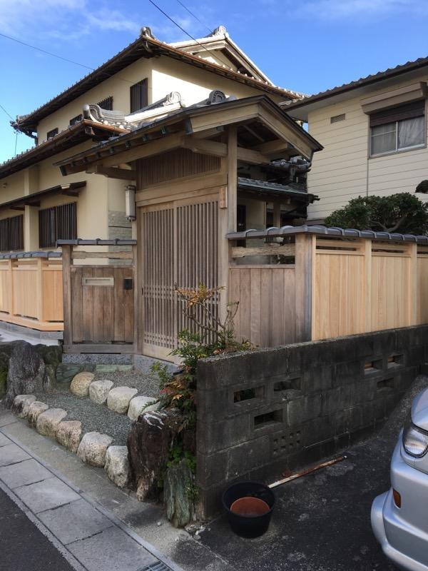生垣部分をなくしてアルミフェンスを設置したいとご依頼頂きましたが既設の立派な数寄屋門がありましたのでその雰囲気を壊さない板塀をご提案させていただきました。最後に数寄屋門も薬剤で洗いをかけ新設部分にひけをとらない輝きをとりもどしました。
