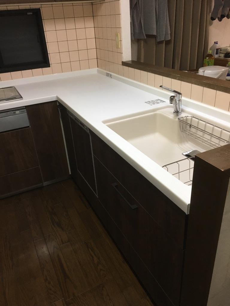 本来作業スペースが広く、使いやすいL型キッチン。ですが、置き型の食洗器のせいでスペースが使い切れていませんでした。また、食洗器用のホースが水栓金具から分岐してシンクにかかっている為、余計な掃除も増え、奥様のプチストレスになっていました。今回ビルトインタイプの食洗器を設置したことで、余分なホースがなくなり、作業スペースも格段に広くなりました。置き型食洗器を使用していらっしゃるお客様は是非ビルトインタイぷをご検討ください!きっと快適に使用していただけますよ♪