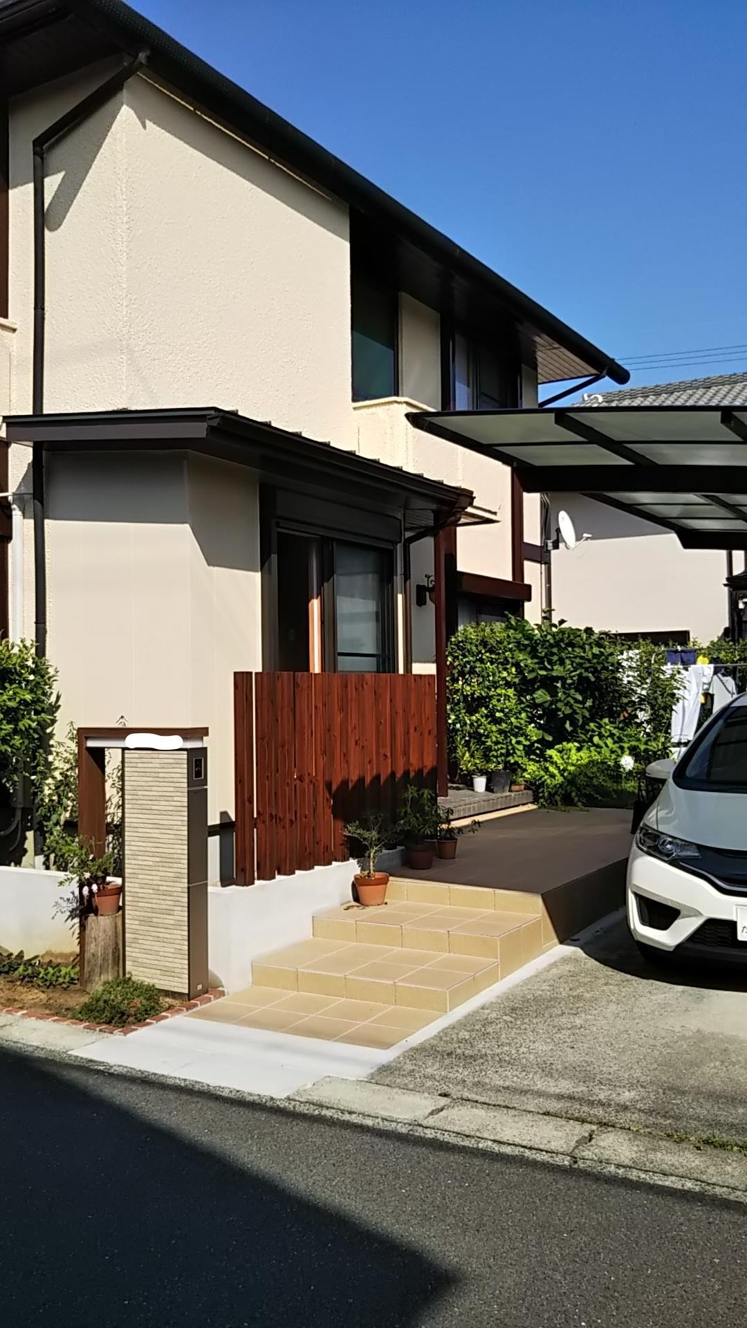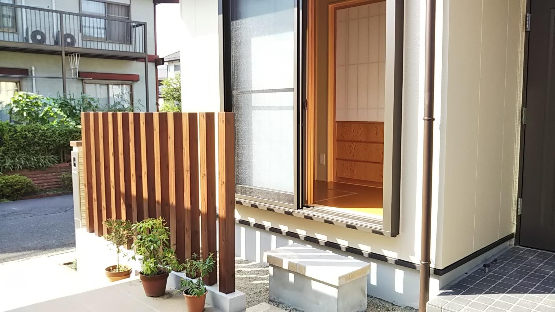 増築にあたり、外構もやり直しが必要となった為、古くなっていた門塀と門扉を取り払い、オープンながらも緩やかに目隠しできる木質ルーバーを取り付けました。