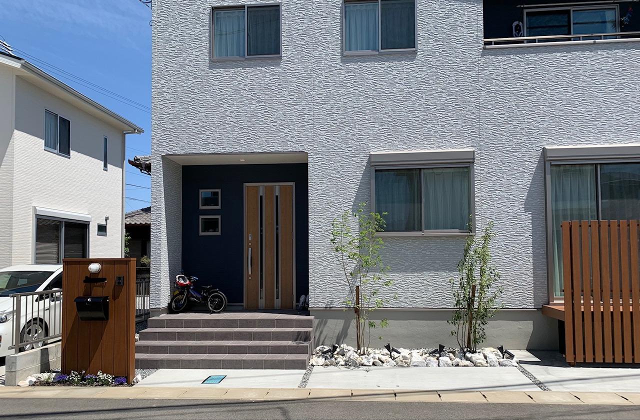 中央には小さなロックガーデン、門柱の足元にはフラワーガーデンととても素敵な外構が完成しました。