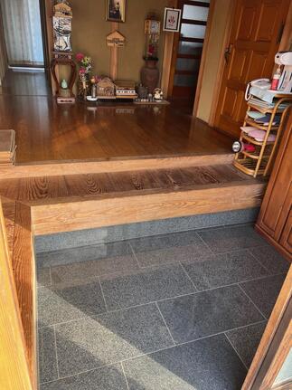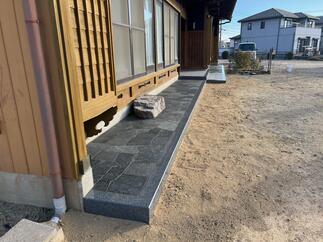 御影石をベースに天然石を使用し、沓脱石(くつぬぎいし)にはご両親のお家に置いてあった石を使用しました。