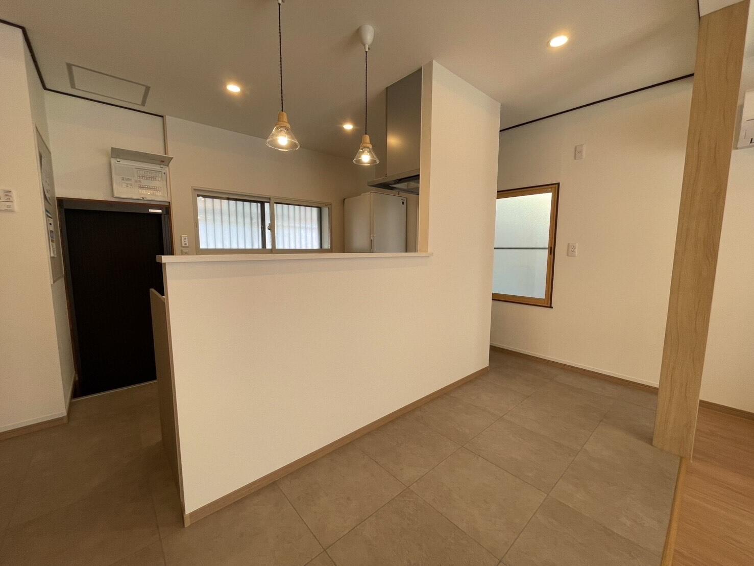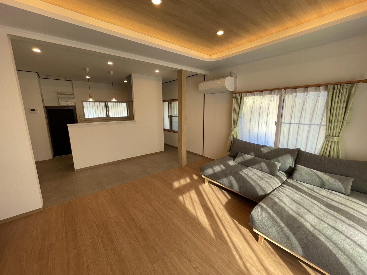 キッチンとリビングを1フロアにして広々とした印象に。 リビングの掘り込み天井がクロスを張り替えただけで、見違えるほど素敵な空間になりました!