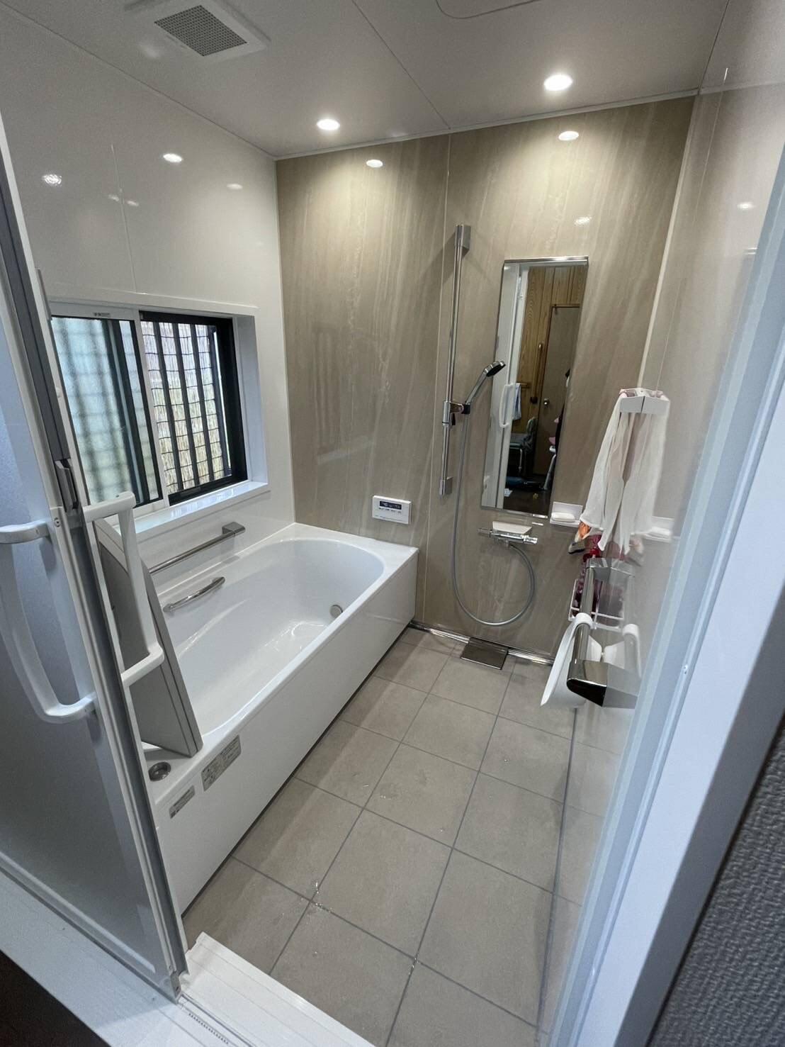 タイル張りの古くなったお風呂が、ぴかぴかのユニットバスへ大変身! 窓も新しいものへ交換し断熱性も防犯性もUPしました。 お風呂の工事は寒くなる前の今の時期がおすすめです。