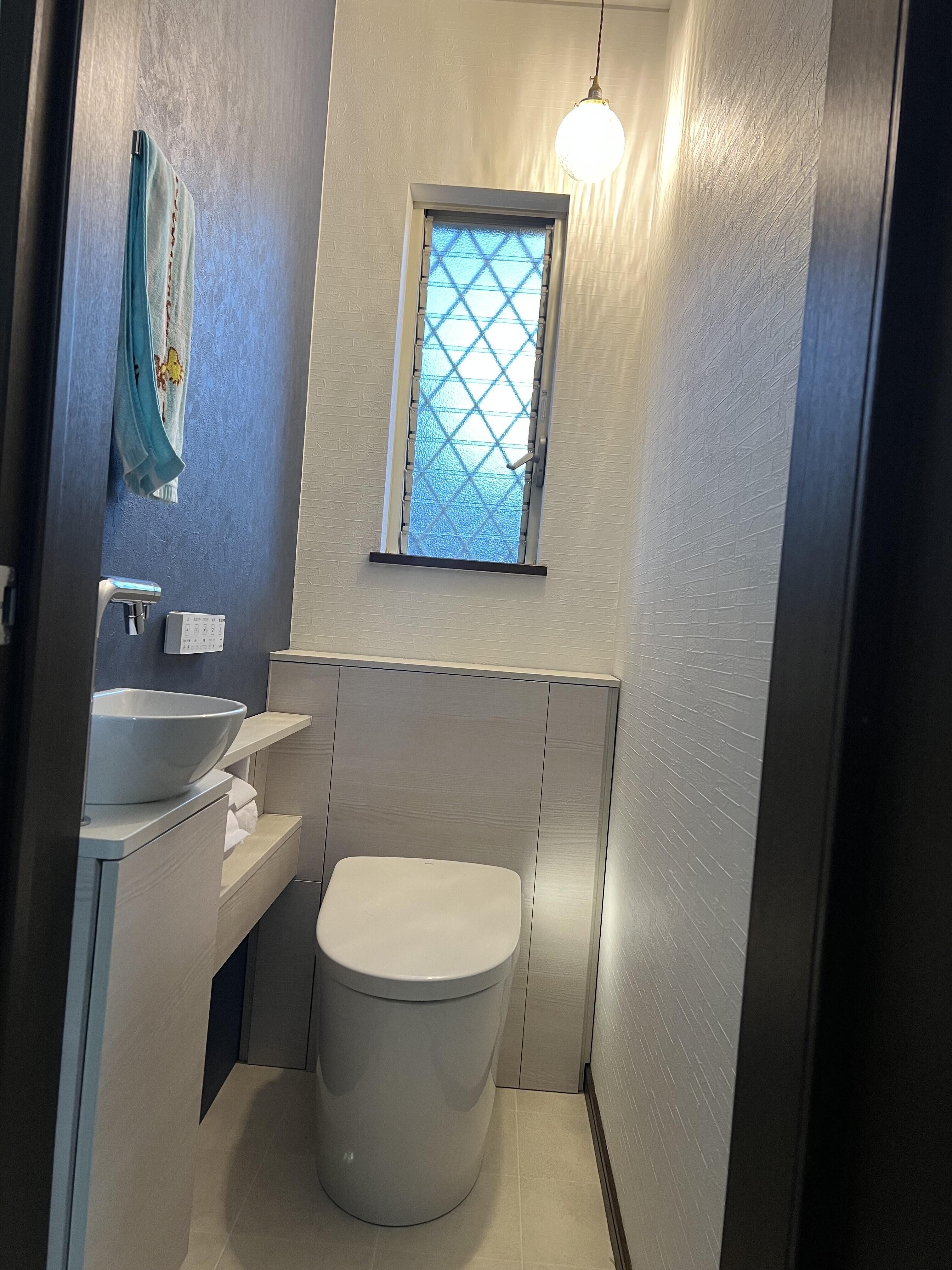 奥様こだわりの1Fトイレは給水排水工事をしなくても、別の手洗器が付けられるものをお選びいただきました。