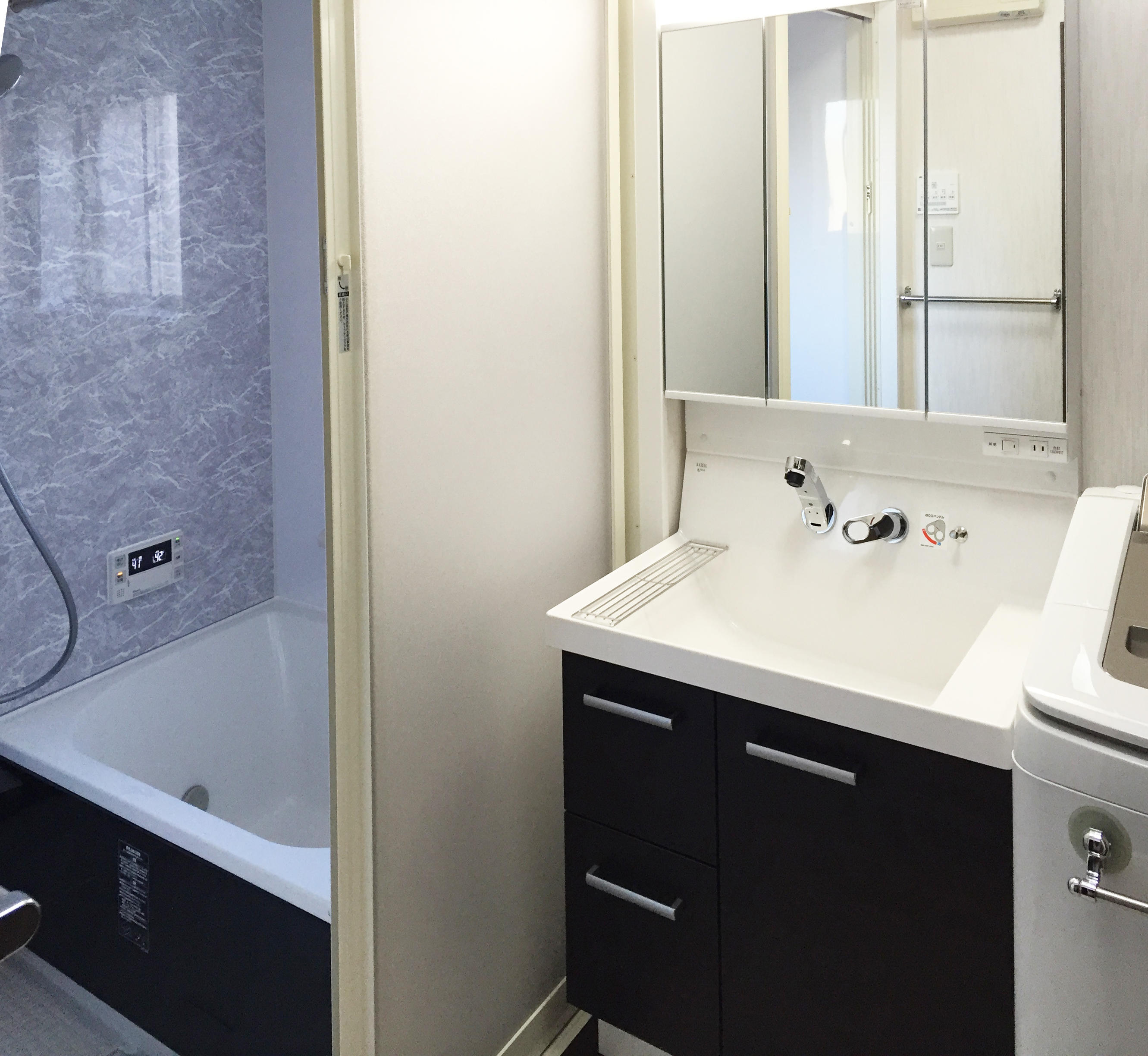洗面室から洋室への段差がなく、引き戸のため小さなお子様から高齢者まで、誰もが使いやすい浴室となりました。また、洗面室と浴室のカラーを統一することで、スッキリしたイメージの空間となりました。