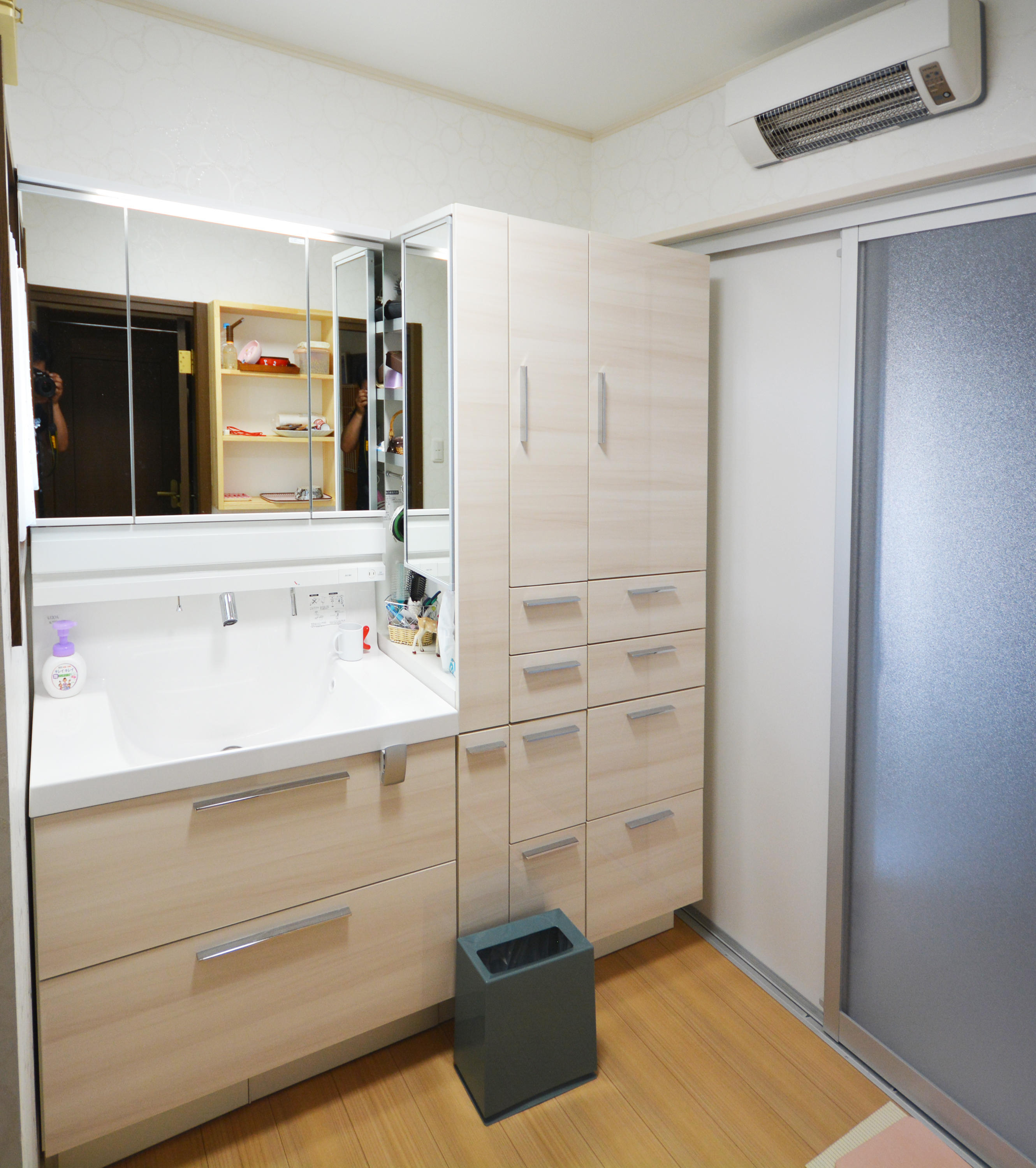 洗面室はヘアケア製品や基礎化粧品など、小物であふれがち…タオル類はもちろん、できれば着替えや部屋着も収納できるスペースがあればとても便利です。O様邸はそれらを実現され、さらにヒートショック防止のため、脱衣室暖房も備えた、安全で使いやすい洗面室となりました。