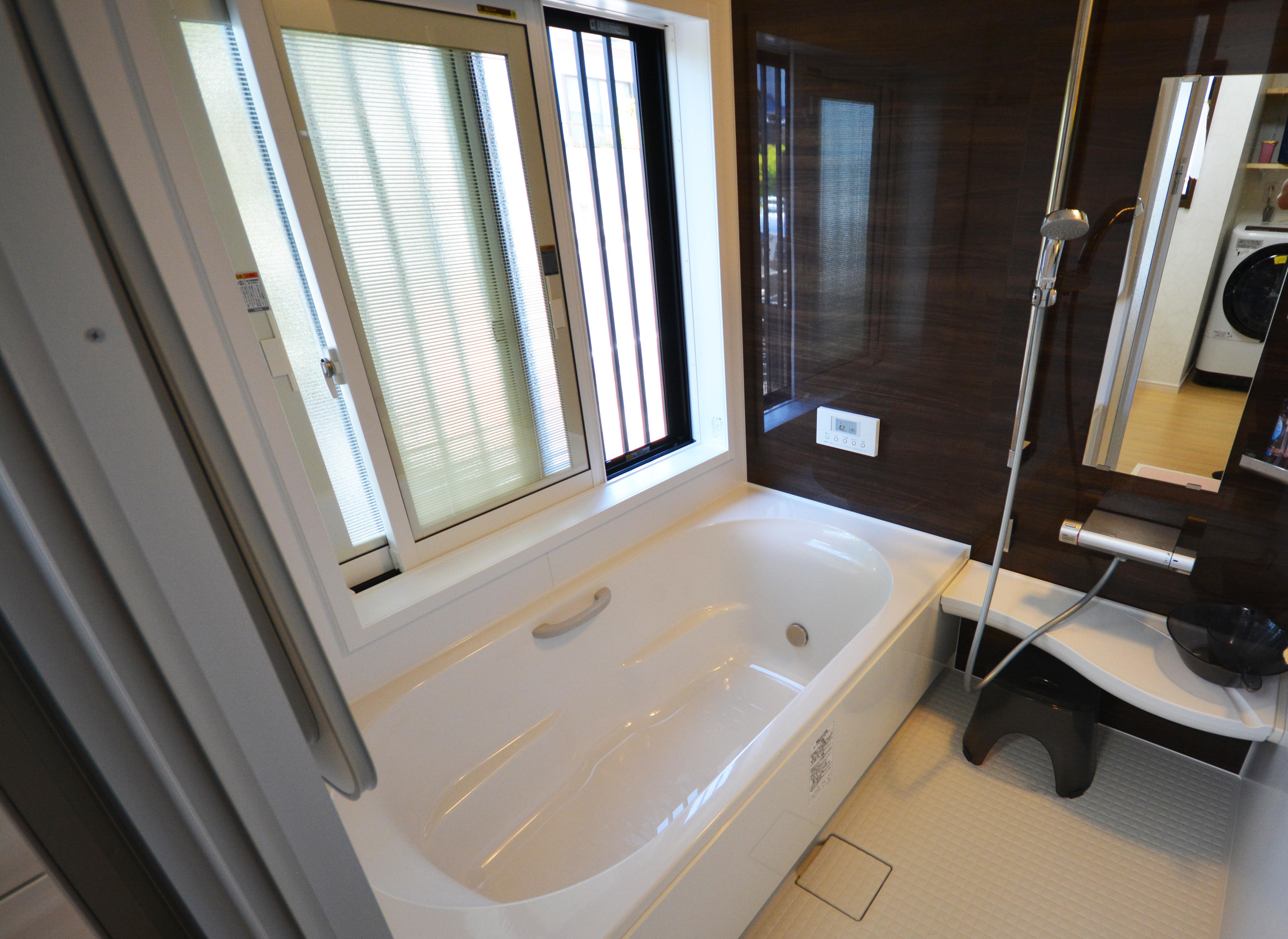 窓を大きくしたことで、開放的な広々とした浴室となりました。ご家族にはお年頃のお嬢様もいらっしゃるので、防犯面にも配慮し、面格子やブラインド内蔵型のサッシも設置しています。