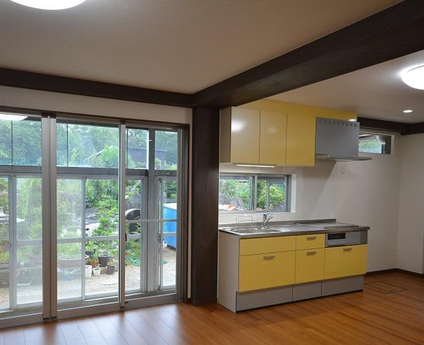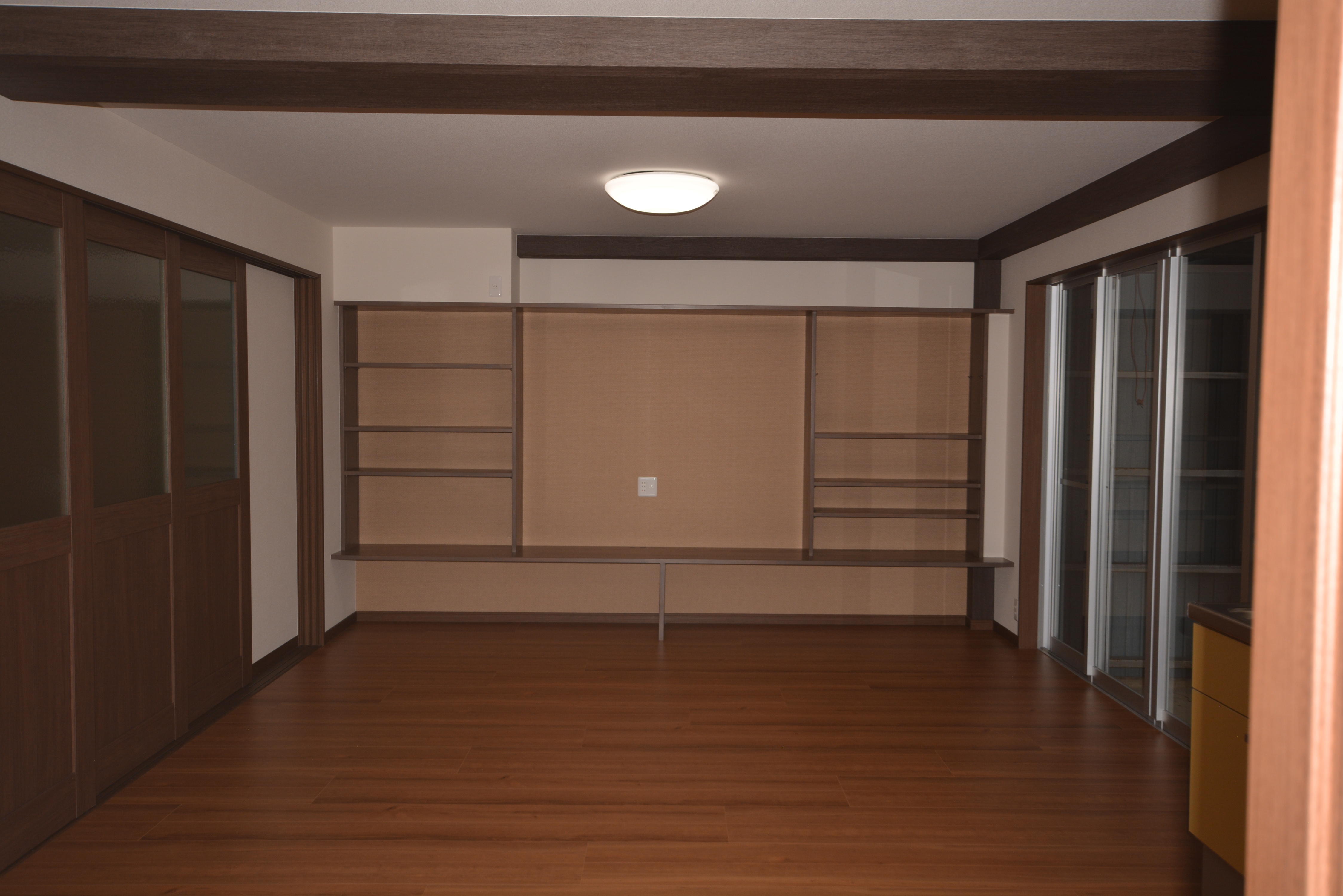 子どもさんも巣立たれ、ご夫妻のためのコンパクトなキッチンを備えたLDK。倉庫として使われていた部屋なので、鉄骨を隠すために梁のような天井仕上げにしています。一部にテラスを残して(今はこのテラスにウッドデッキが張られています)既存の外壁の中に部屋を作っているので、構造自体も2重になり、寒い地域ですが室内はとても暖かくなりました。