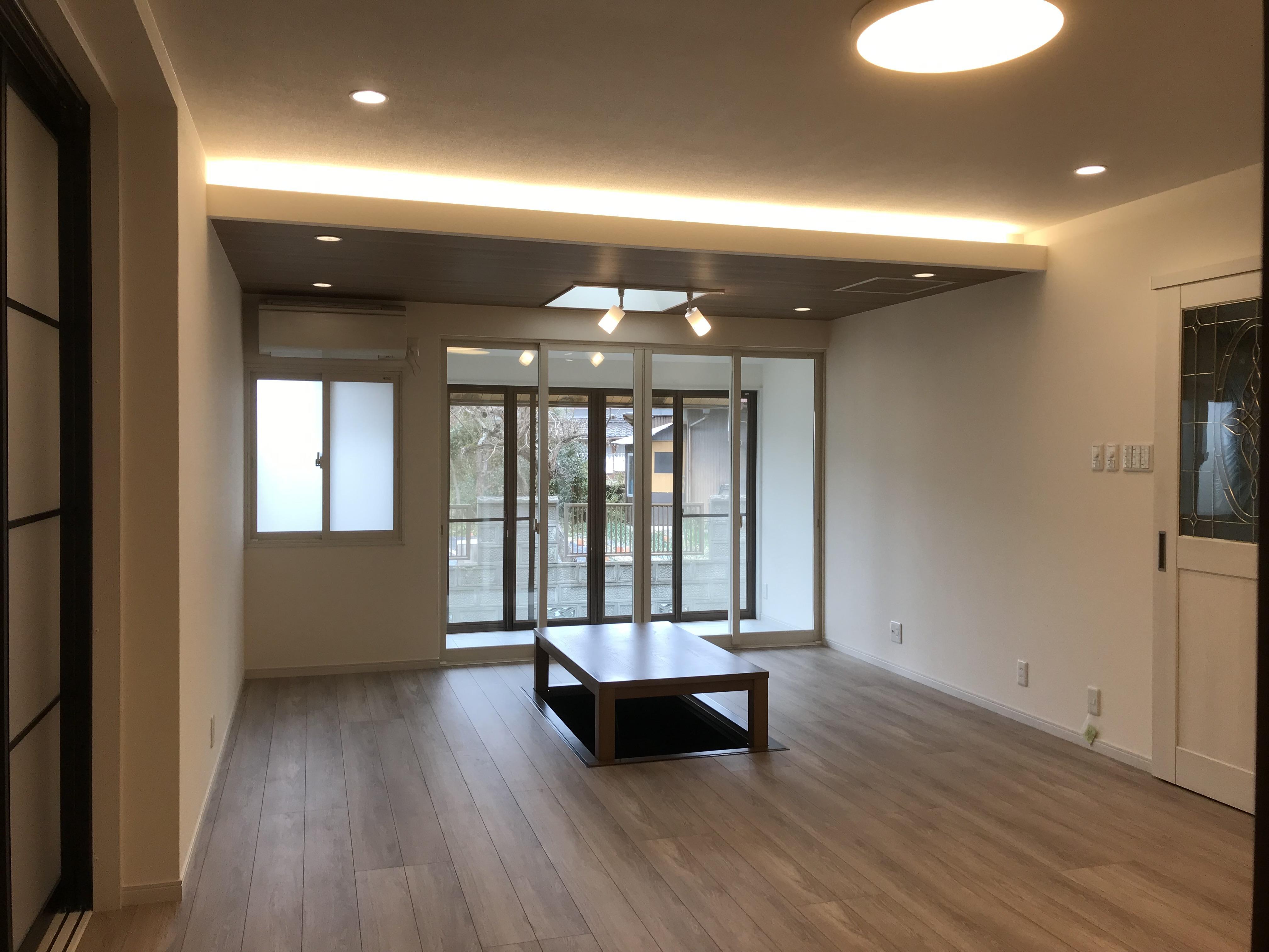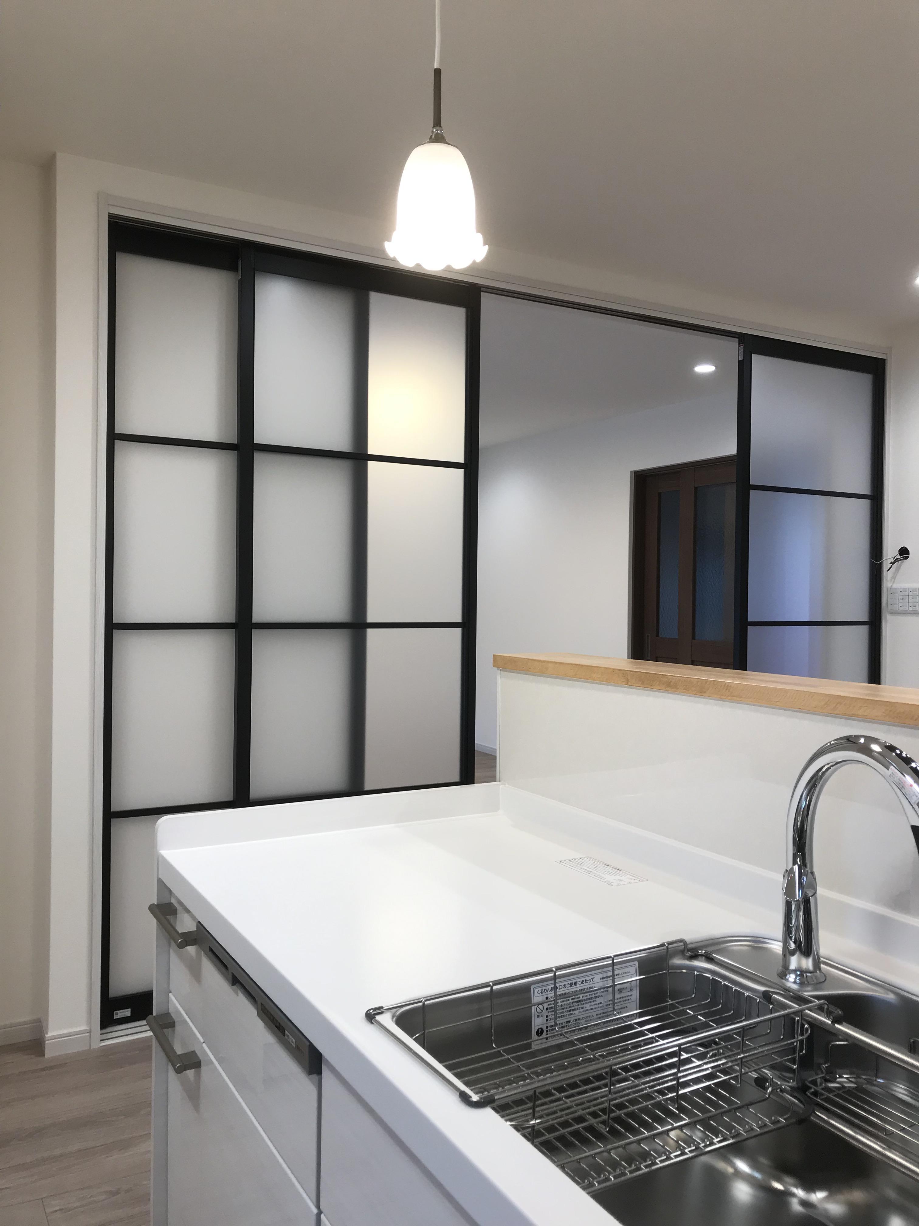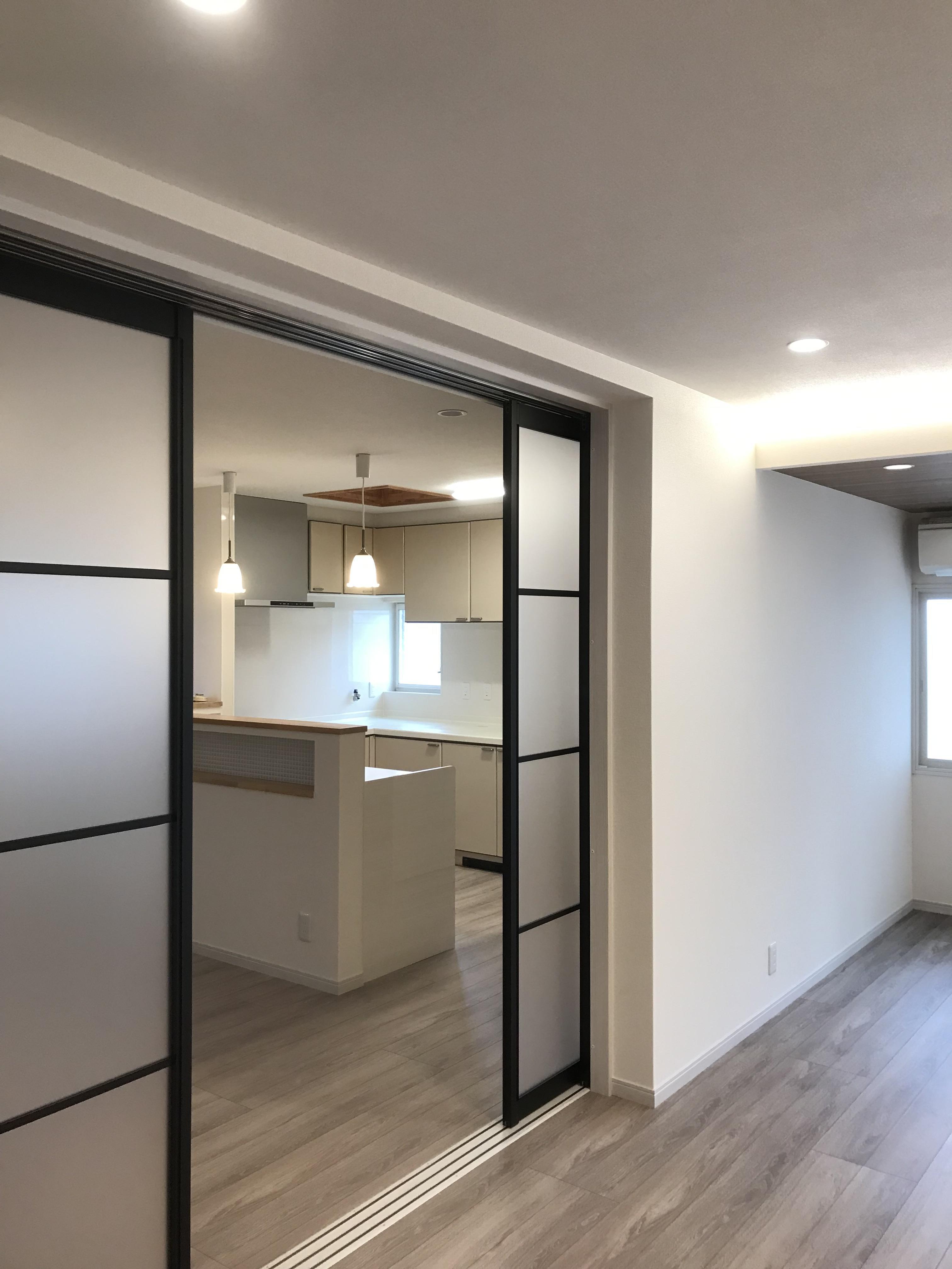 既設のキッチンを残したまま、対面キッチンを追加して新たなLDK空間にリフォームしています。リフォーム前は25帖のワンルームで、冬場の寒さ対策も必要な状況でした。そのため、DKとリビングの間にあえて可動間仕切りを設置し、空間を分けて使えるようにしています。また、寒さの原因となっていた増築部分の掃き出し窓からの冷気を抑えるため、リビングの面積は減りますがインナーテラスとして使用できるように内側にインプラスを設置しました。インテリアも奥様のテイストに合わせたエレガントな空間でありながら、リビングに持ち込まれる黒物家電(テレビなど)にもなじみやすい、甘くなりすぎないLDKとなりました。