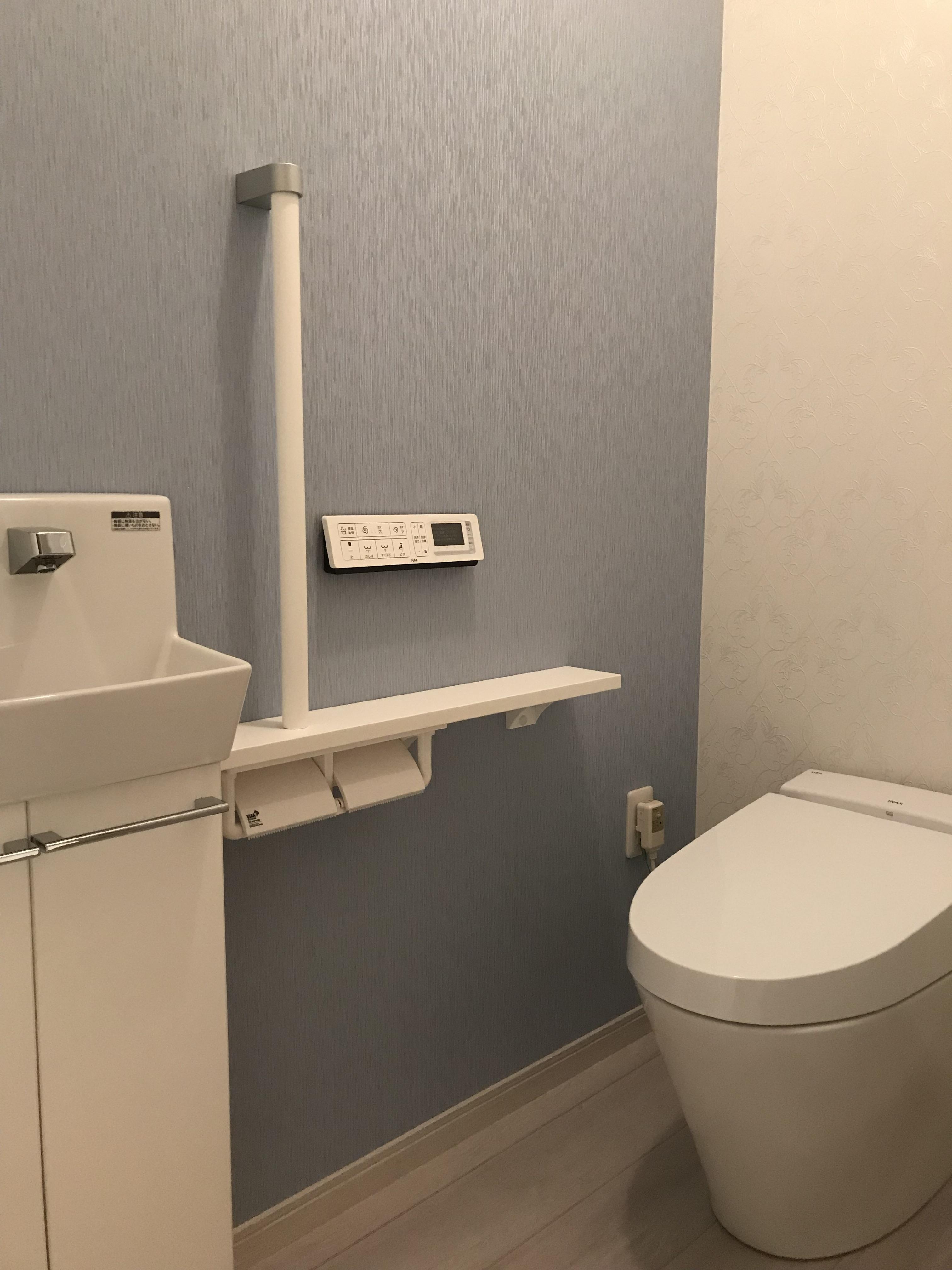 ほんのりラメが入ったブルーのアクセントクロス。真っ白な設備機器を引き立てて、エレガントで清潔感のあるトイレ空間となりました。
