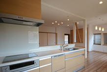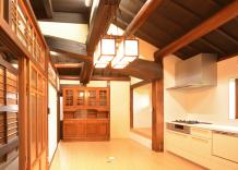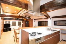 家族や友人との会話が楽しい、梁を活かした対面キッチン