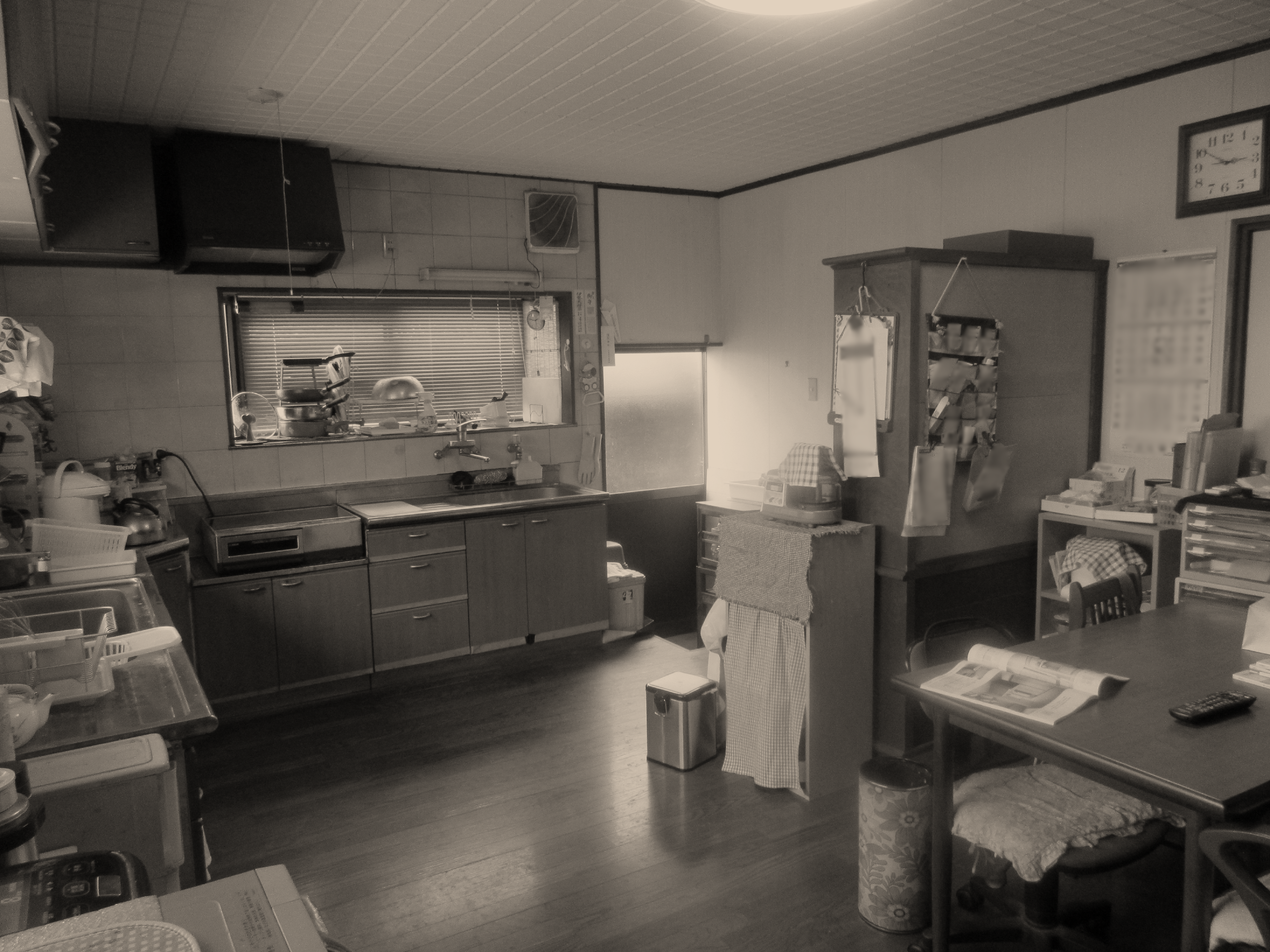 既存のL字型の壁付けキッチンは収納量が少なく、しまいきれない調理器具などは出窓や作業スペースに置かれていました。