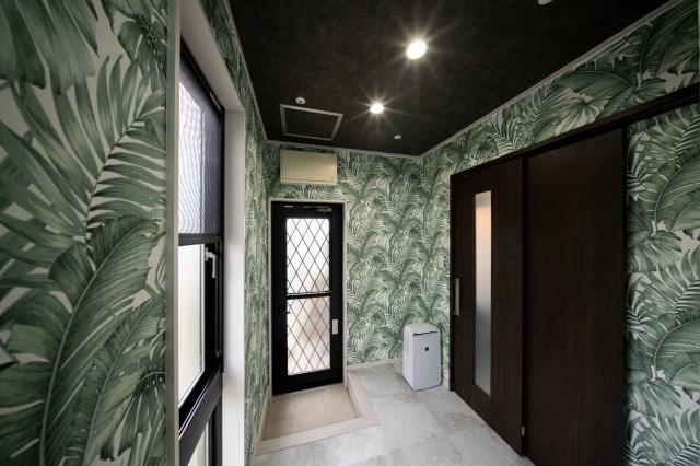 キッチンの奥の扉を開けるとユーティリティがあります。天井クロスは黒色で締めて、壁面をボタニカル柄で仕上げた大人ナチュラルな空間。壁クロス:サンゲツ【FE74454】