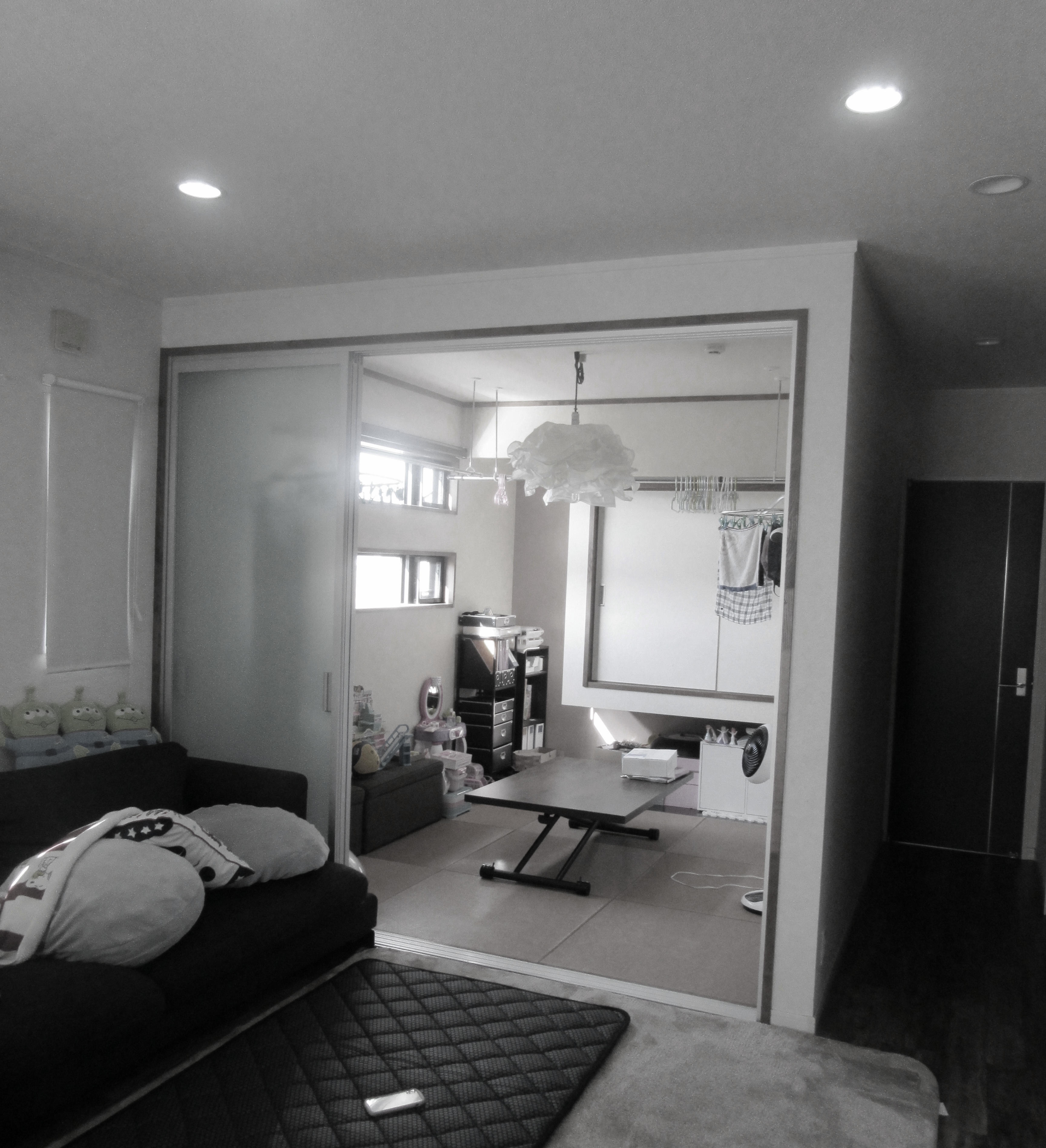 物干し部屋として使われることの多かった4.5帖の和室はリビング部分を広く取るようにして新たな壁を設置しました。ちょっとした日用雑貨を置いたり衣類を掛けたり。ポールも設置してお部屋干しが出来るスペースになっています。和室にあった押入れと床の間のスペースはクローゼットになり、収納たっぷりです。