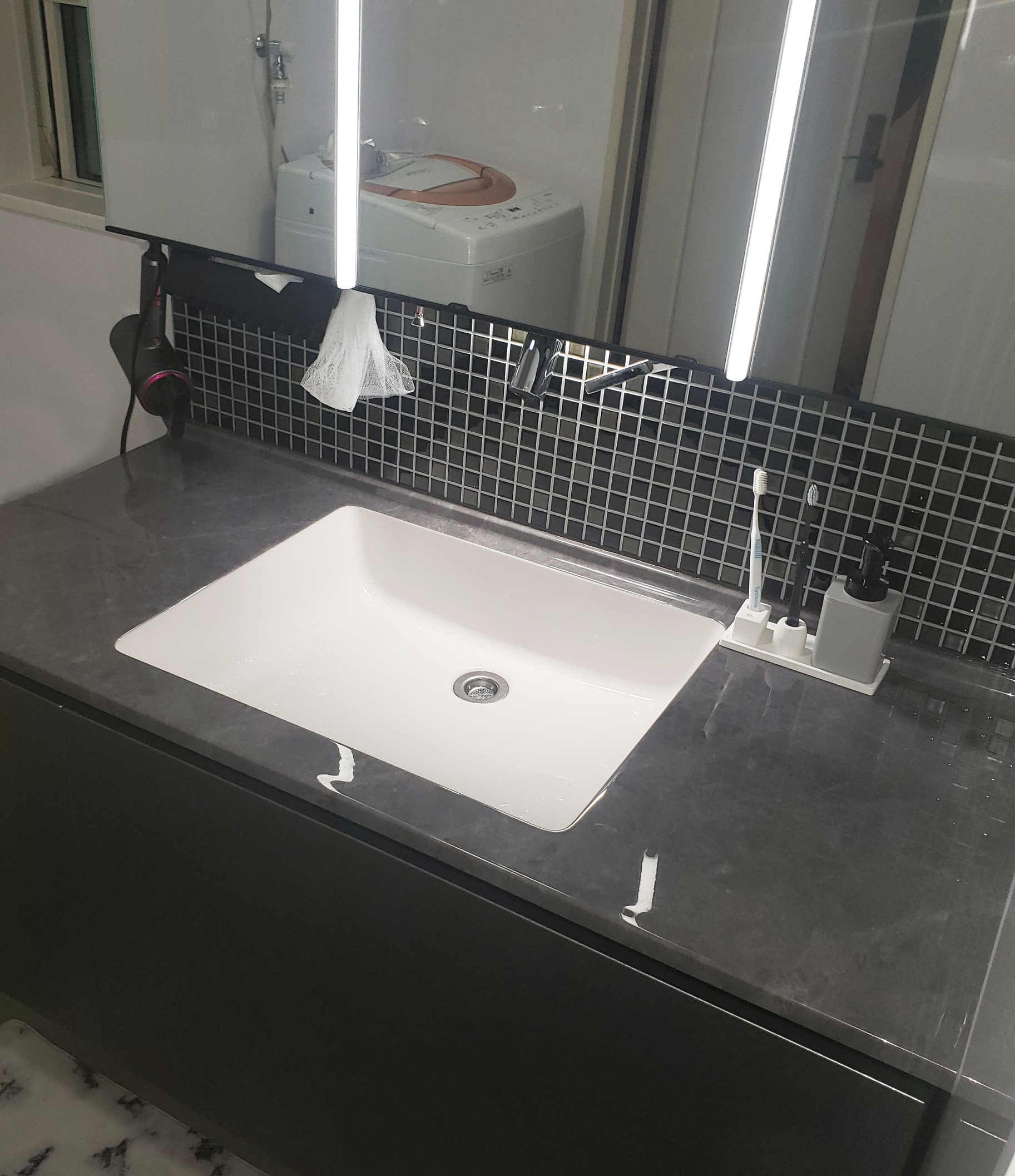 間口1200の広々としたカウンターでゆったりと余裕をもってご使用いただけます。タッチレス水栓を採用。手をかざすだけでお水が出ますので水の出しっぱなし対策ができて節水効果が期待できます。上から吐水で水栓周りに水がしたたり溜まることがないのも嬉しいポイント。フェイスフルライトはお顔をまんべんなく照らしてくれますので、お化粧の塗りムラや髭の剃り残しのチェックにもおすすめなライトです。バックパネルにはタイルパネルを貼付。モザイクタイルは良いアクセントになりシックな空間にピッタリ。