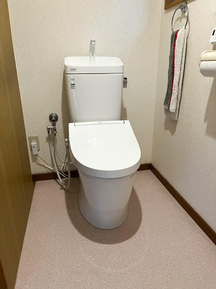 トイレ取替工事のご依頼をいただきました。 きっかけは水漏れでトイレを使用することが難しかったからです。トイレを新しく取り替えて、床はクッションフロアに貼り替え、雰囲気ががらっと変わりました。とても綺麗にしていただいて、満足です。とお客様からもお喜びの声をいただきました。一新したトイレで気分もすがすがしくなりますね!