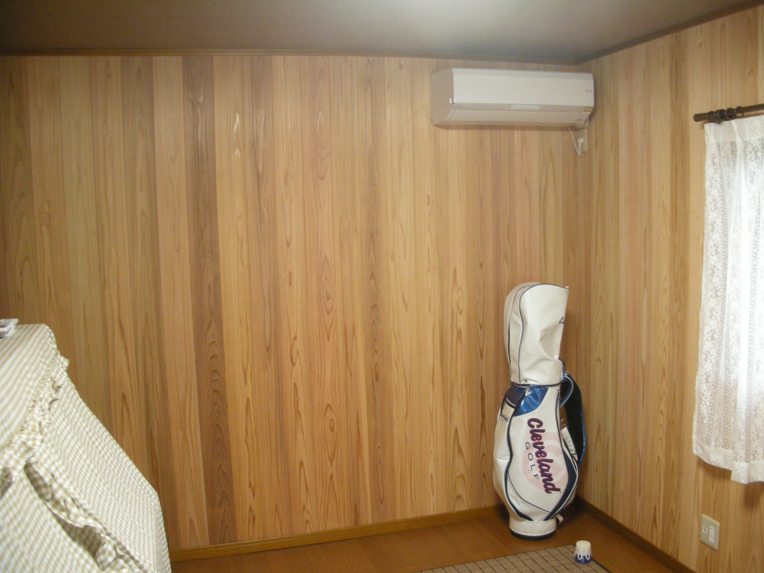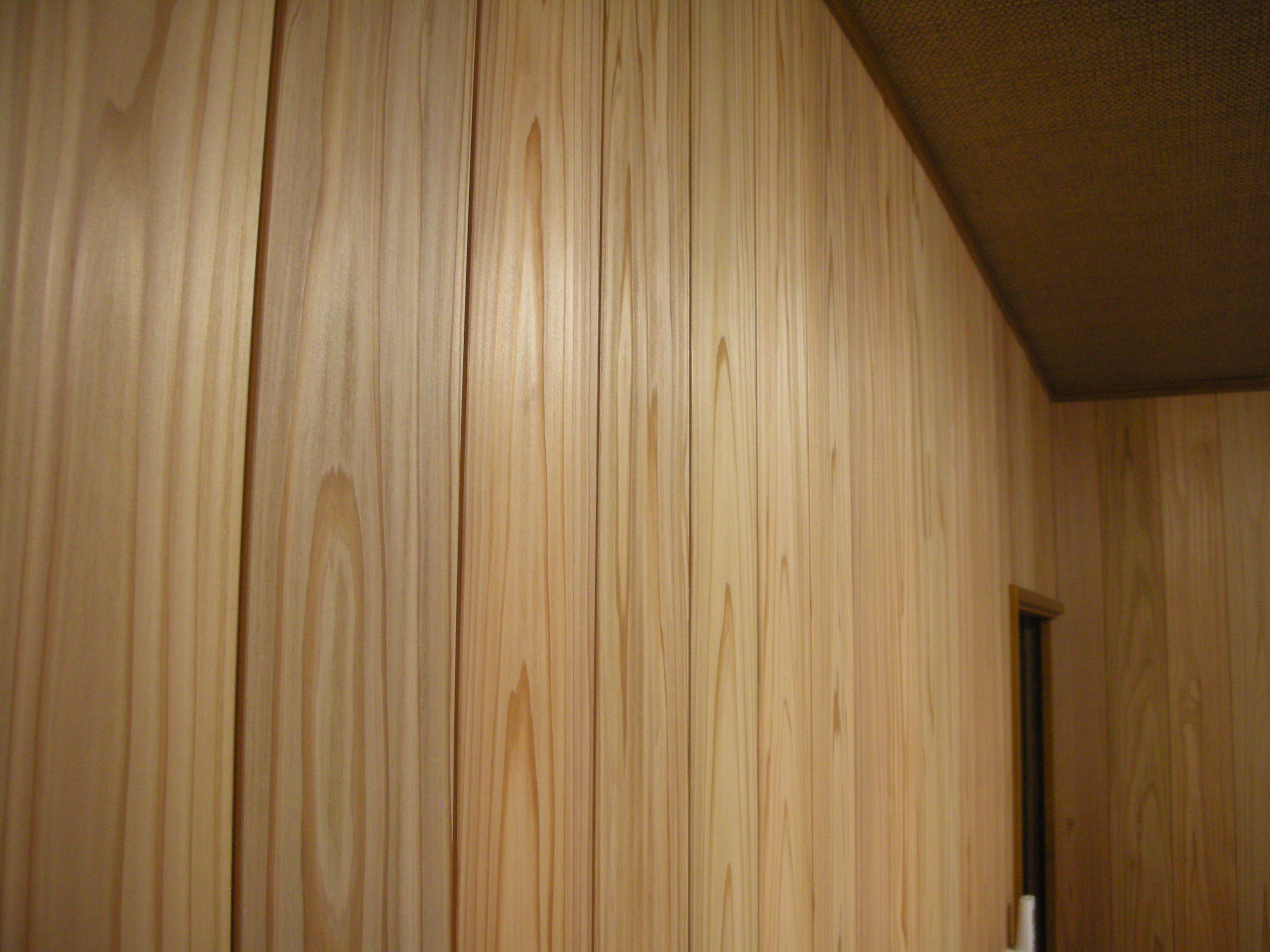 表面に何の加工も施していない無垢の杉板を壁全面に施しております。湿度調整など木材本来の特性と杉の良い香りが部屋全体に香ります。15cm幅の板を1枚ずつ丁寧に施工致しました。