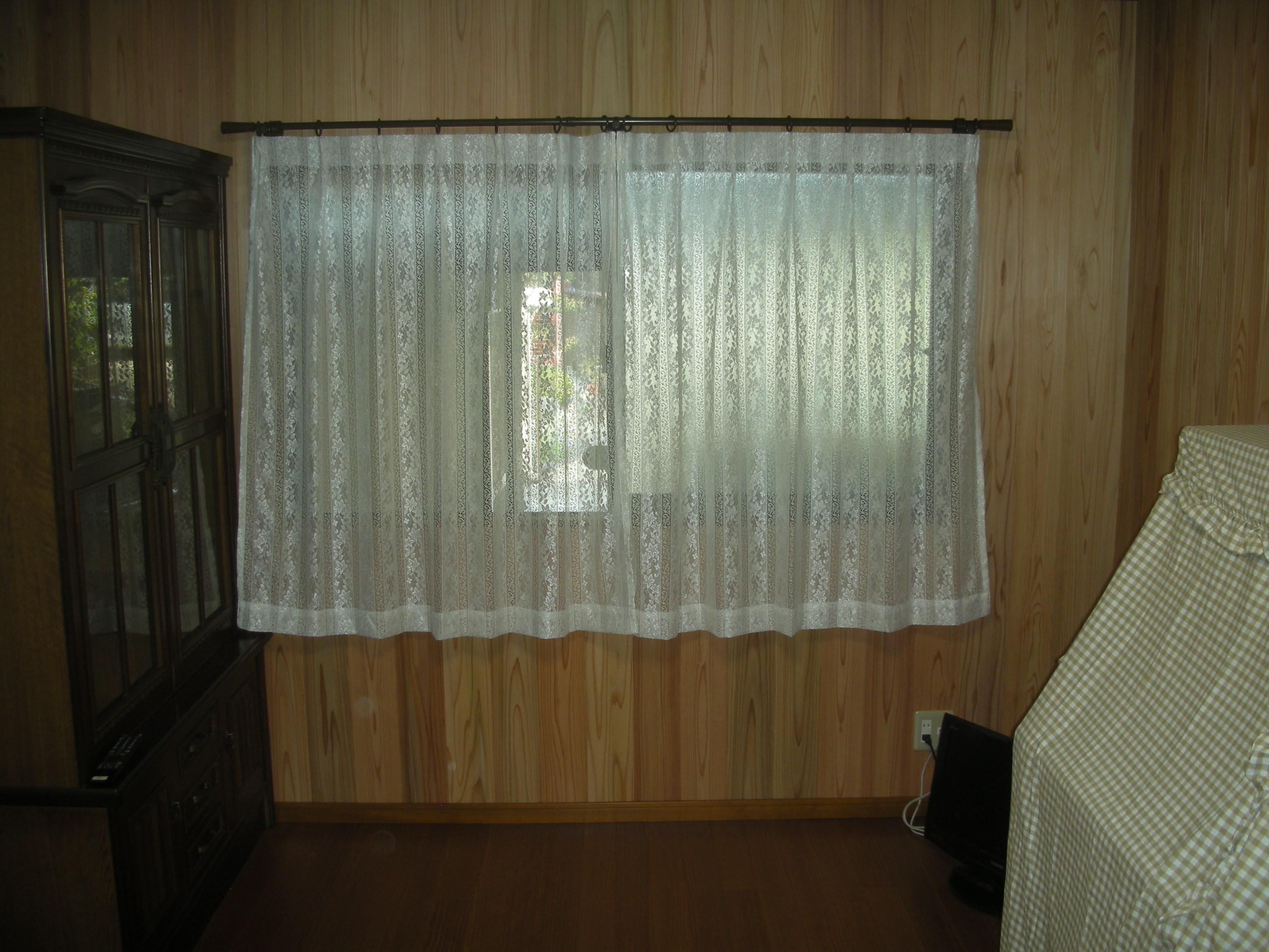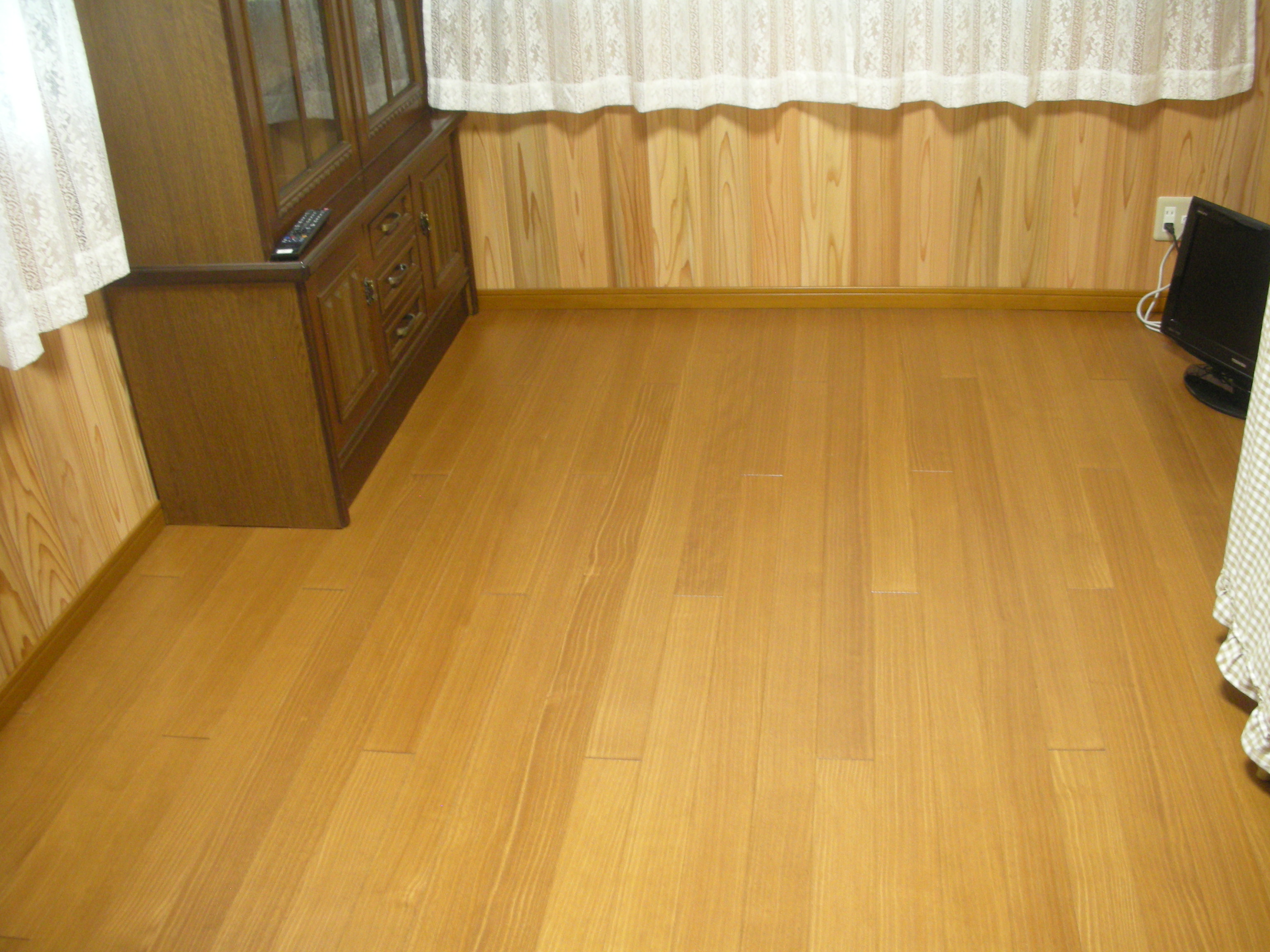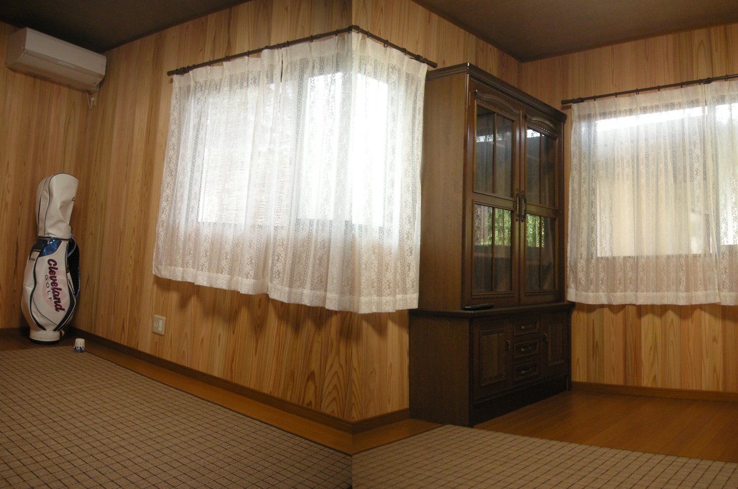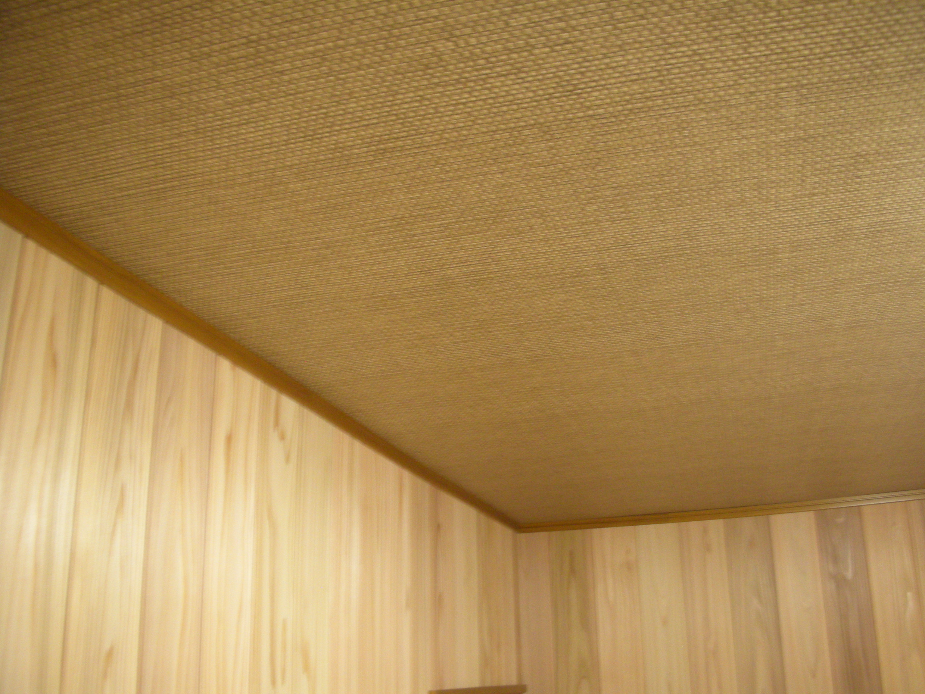 天井はクロス(壁紙)仕上げです。壁・床に合う洋室の模様ということで選定には弊社スタッフがお施主様と打ち合わせ、この模様になりました。壁・床が木目ということもあり、天井もそれに負けない色合い・模様をとお勧めいたしました。天井は基本的に壁よりも強い・濃い色の方が調和します。お施主様も納得の仕上がりでした。