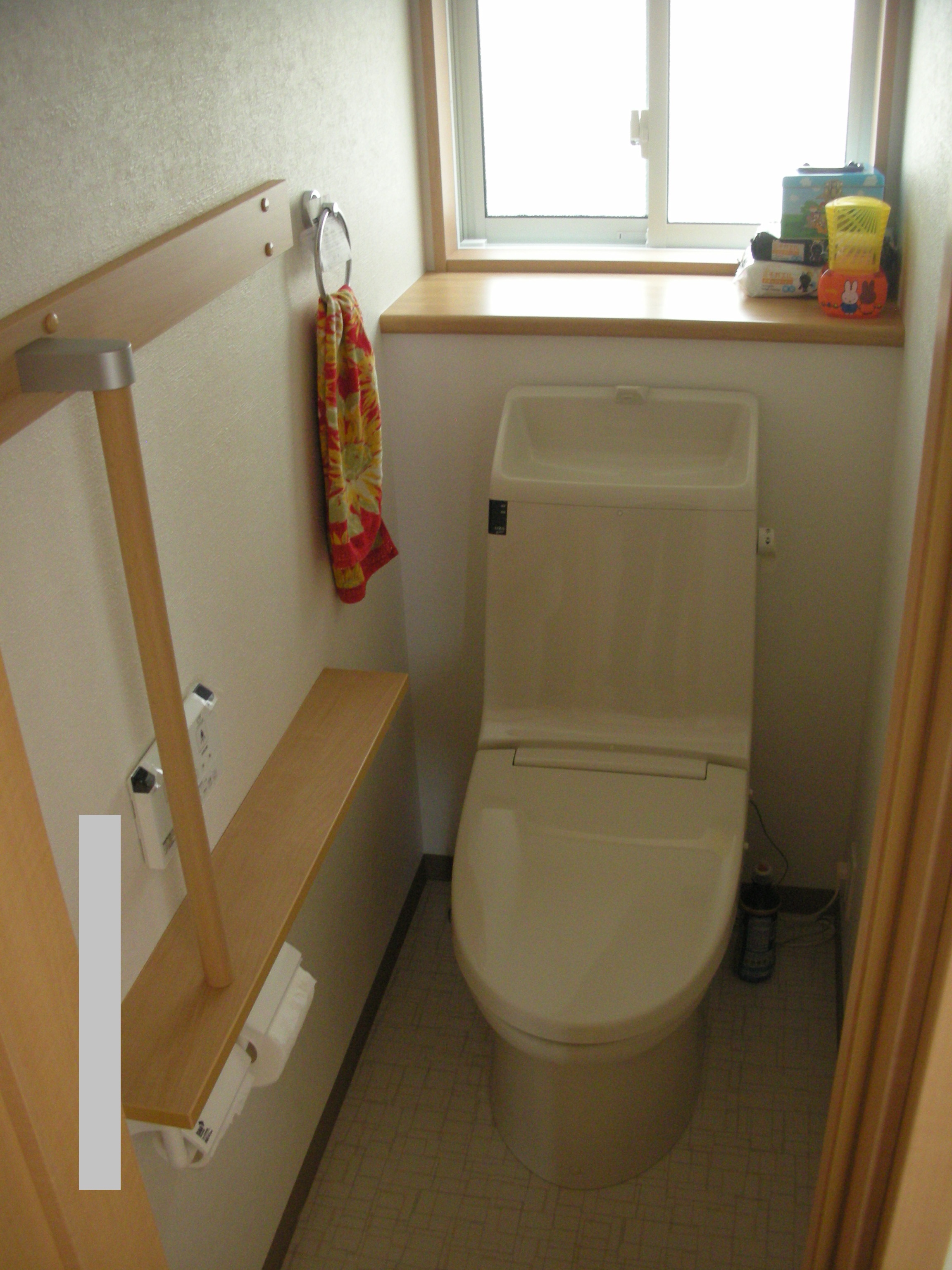 リフォームでの手すり設置は、構造体に直接固定しなければいけないため、設置位置が自在に決められないことが通常です。こちらの後付棚手すりは、手すり位置を自在に決定できるので大変喜ばれました。カラーも窓枠・ドアと色を合わせることができたので実によく馴染んだ仕上がりとなりました。