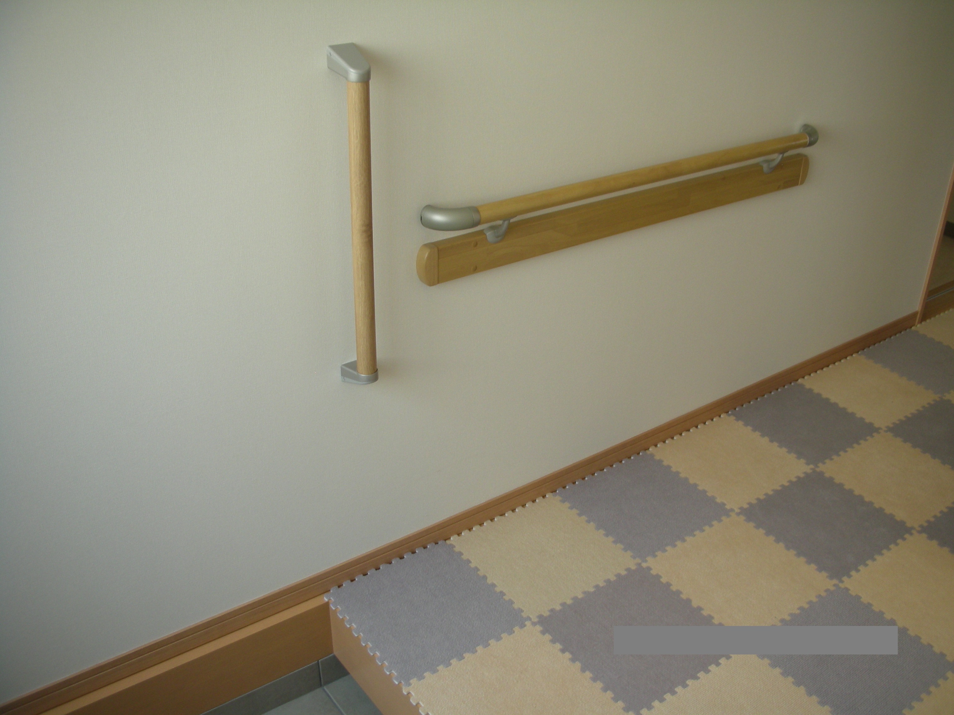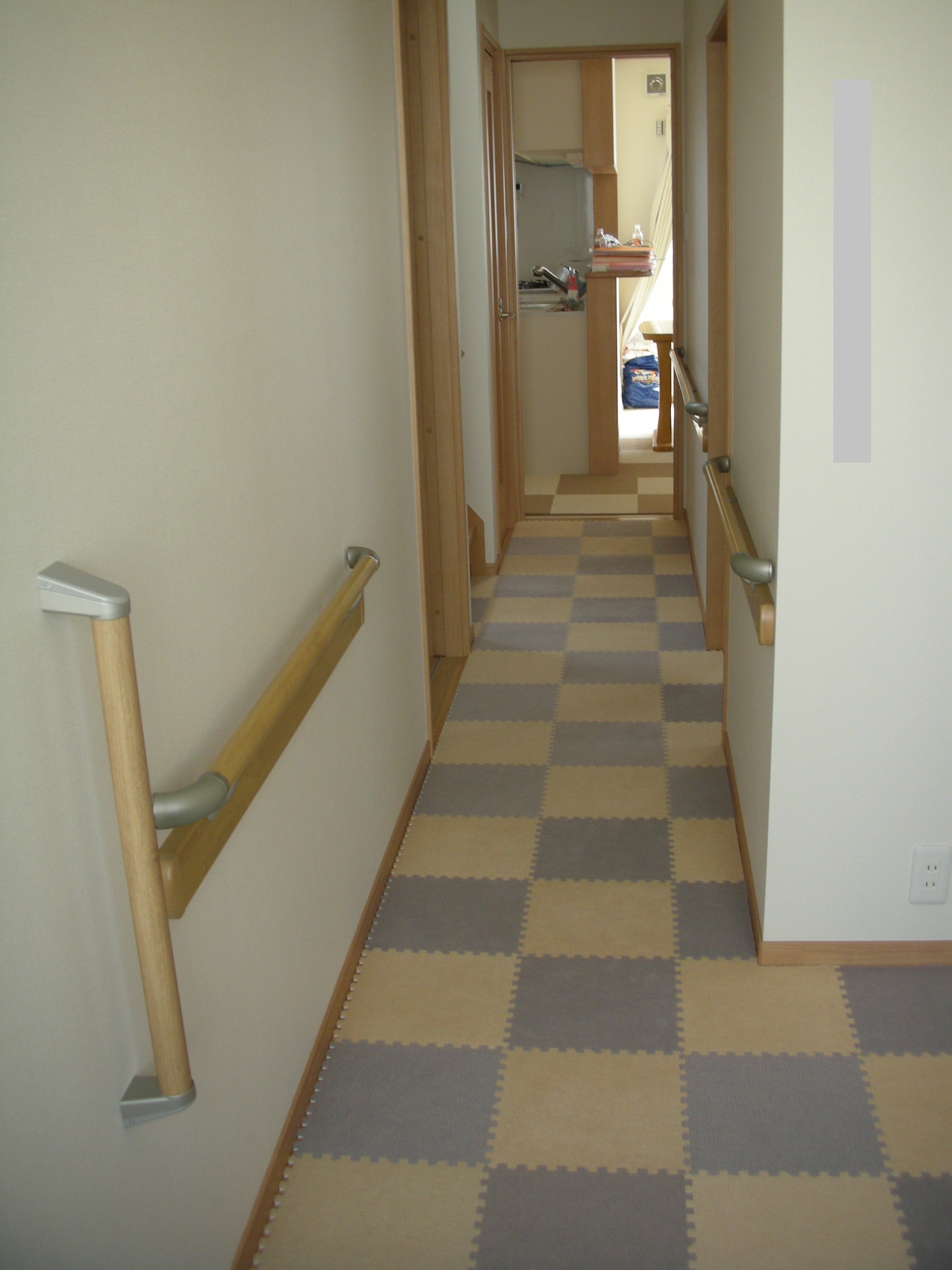 玄関で安全に立ち上がり、スムーズに廊下を移動するための手すりを設置しました。やはり、後付の手すりは設置位置に制約がありますが(※I型位置にちょうど柱があり、スマートに収まりました。)固定位置を調節できるベース一体型商品の為、見た目もスマートに思い通りの位置に設置ができました。