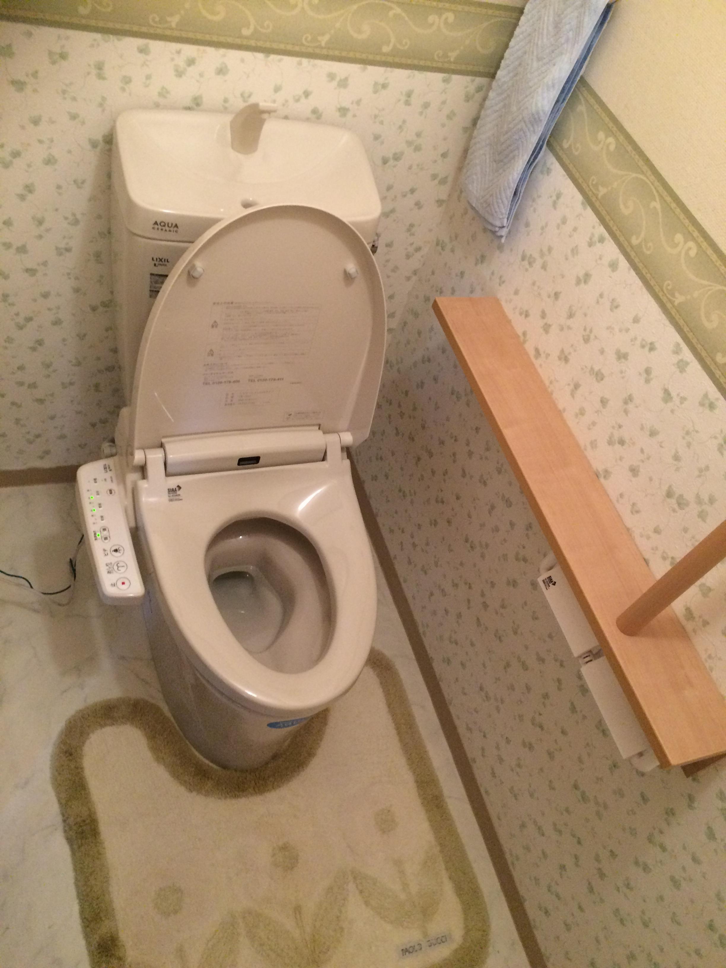 トイレをより安全に綺麗に使いやすくしたいとの事でリフォームを行われました。ご夫婦にて住まれているお宅でしたが、リフォームの相談は別に住まれている娘様よりご相談をいただきました。楽に立ち座りする為に手すりと、掃除のしやすいトイレにしたいとのことで、100年きれいが続くLIXILのアクアセラミック便器を御提案した事と床面を防水効果のあるクッションフロアの上張施工をお勧めいたしました。