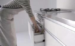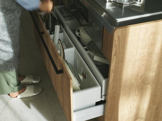 かがんだ姿勢でないと奥のものが取り出しにくかった開き戸収納を引出式へ変更。中のものが見やすく取り出しやすい収納になりました。「ツールポケット+スライドボックス」はよく使うものは手前のツールポケットに、次に使用頻度が高いものはスライドボックスに納めることで作業効率が格段にUP。外置きの食洗器も収納されスッキリ美しいキッチンに生まれ変わりました。