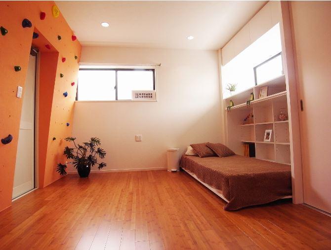 断熱材も通常より厚いものを、サッシは二重サッシ、カーテンも断熱性に優れたものを採用。 収納が欲しいということで、壁面一面とベットのうらに大容量の収納スペースを設けました。 また、ベットは収納できるように設計、収納時には子供が広々と遊べるようにしました。