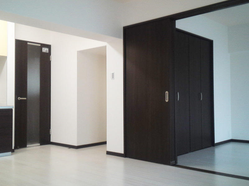 床の仕上げ材がいままでは畳とじゅうたんでしたが今回のリフォームでLDKとローカをフロアー仕上げにしたいとご要望でした。 マンションでは床仕上げ材に防音等級が設定されているため、その点に配慮しました。 細かく仕切られた間仕切りを撤去し大きなLDKにしたものの収納部分はあまり減らしたくない。と言われていたので新たに壁一面に大きなクローゼットを設けました。 今回のリフォームはお住まいになりながらのリフォームではなく、前もって荷物も片付けて頂いていたので、工事がスムーズに進みました。またマンションということもあり近隣の方への工事中の騒音等を心配していましたが、偶然にもマンションの外壁塗装工事と工期が重なり外壁塗装の音が大きかったためその点でも助かりました。