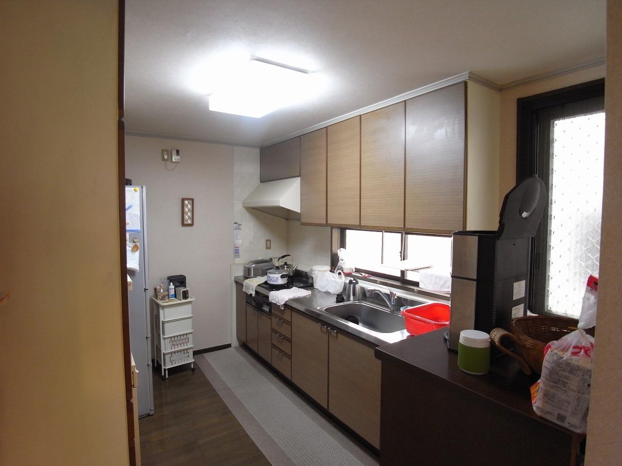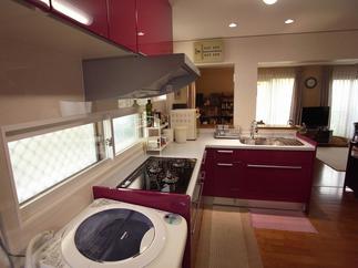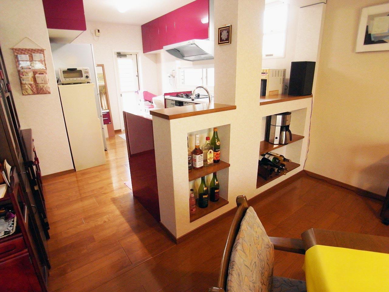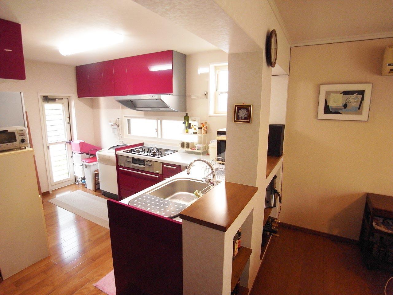 キッチンの位置を移動して、対面キッチンにしました。流し台の後ろの柱が構造上取り除く事ができないので、それを生かしてダイニング側にニッチを設け、飾り棚としても収納としてもご利用頂けるようにしました。またキッチン側に小窓2箇所、勝手口をつける事により、太陽のひかりをふんだんに取り入れられるようになりました