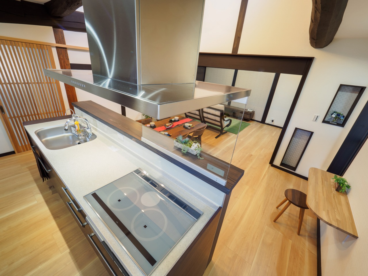 以前は立派な丸太梁が全て隠され、天井が低い居室でした。今回は立派な梁を意匠として取り入れ、天井を一部吹抜けとしFIX窓を設置、とても明るいLDKになりました。
