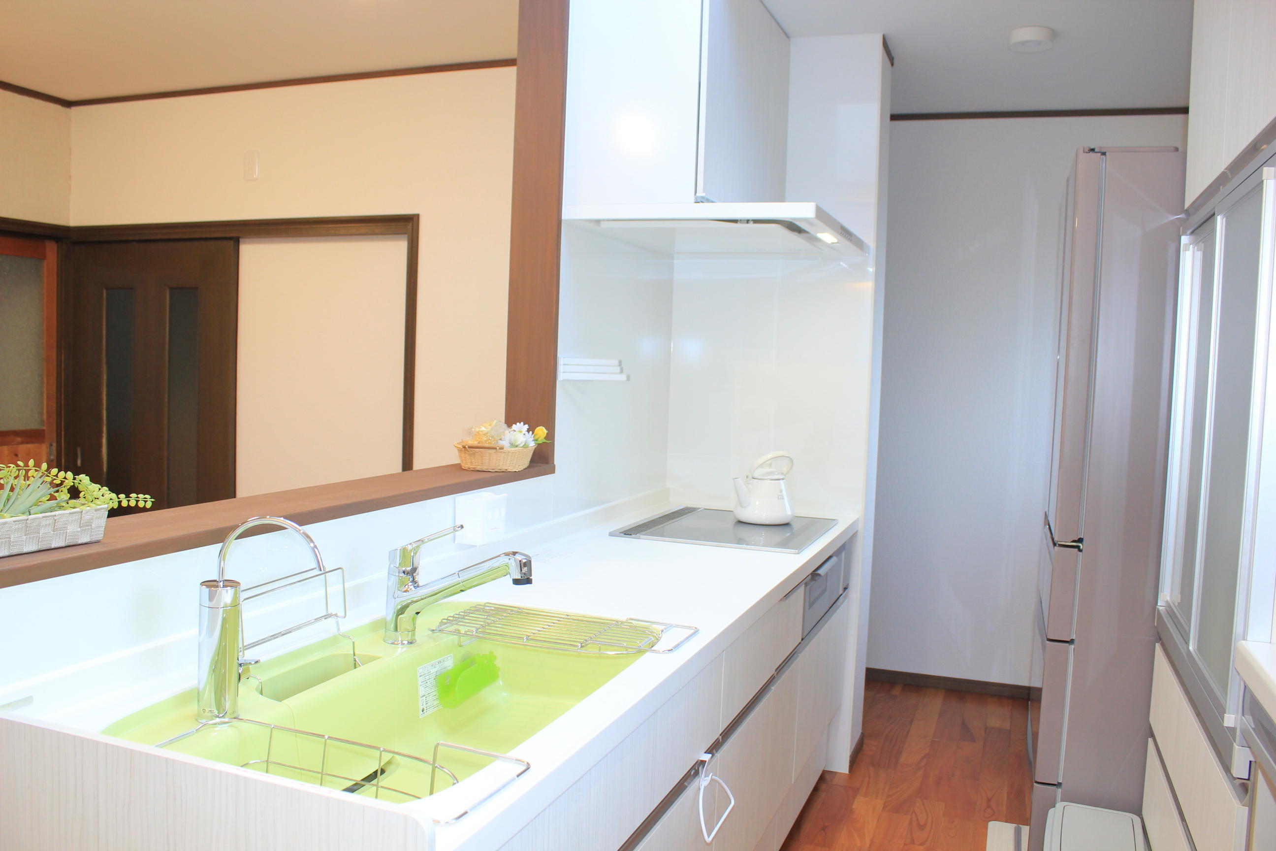 設備が色々壊れていて、使い勝手の悪かった台所。広いのはいいのだけれど、寒くて掃除がし辛い浴室。そんなお悩みをご相談いただき、奥様あこがれの対面キッチンへと改装する計画をご提案しました。キッチン奥の壁を取り払い、勝手口へとつながる廊下へ直接出入りできるようにし、動線もよくなりました。床は無垢のチーク材で仕上げ、とても温かみのあるお部屋になりました。