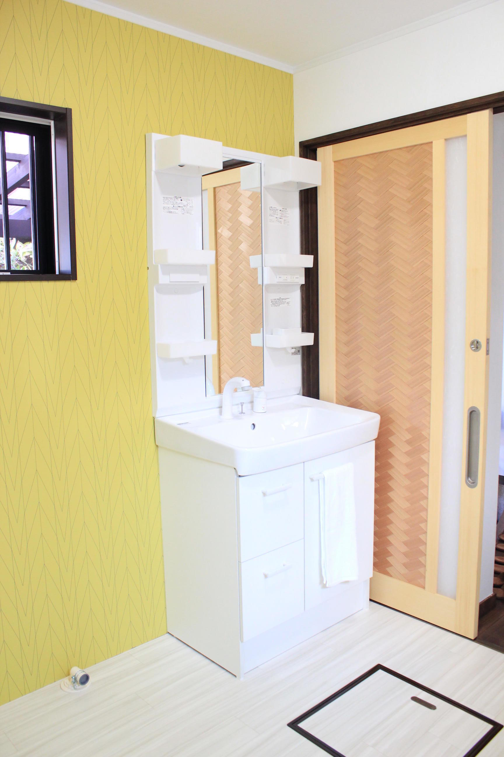 職人さん手作りの網代柄の建具に合わせて、壁のクロスを一面、網代柄で、萌黄色の明るいクロスに仕上げました。