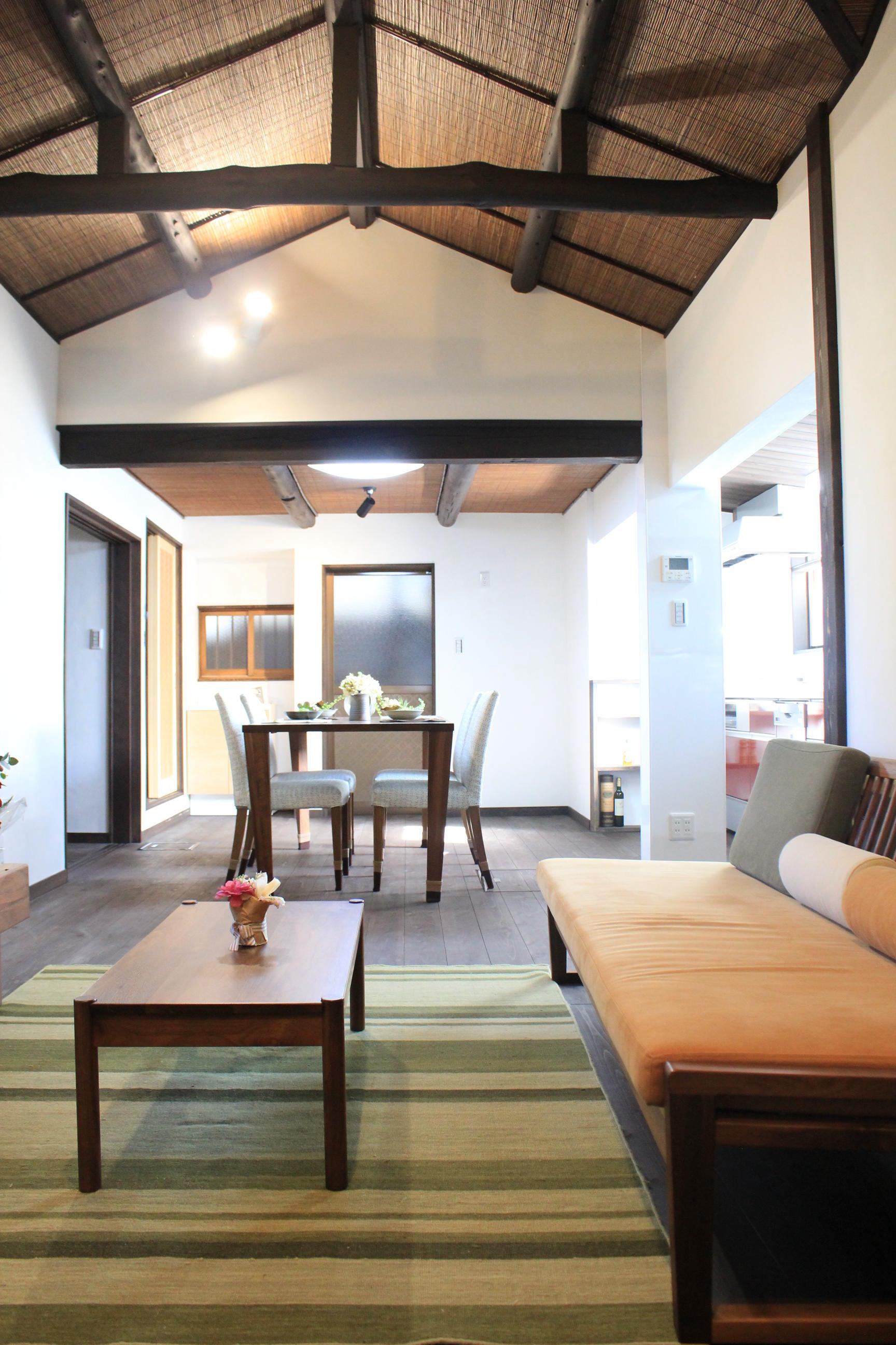 琵琶湖産の葭(よし)と、竹を使った重厚感のある仕上がりになりました。梁を見せる仕上げにし、少しでも天井を高く取れるようにしました。床は杉の無垢板を天然塗料で塗り、壁には珪藻土を使用。建具は全て、地元の職人さんの手作り品です。
