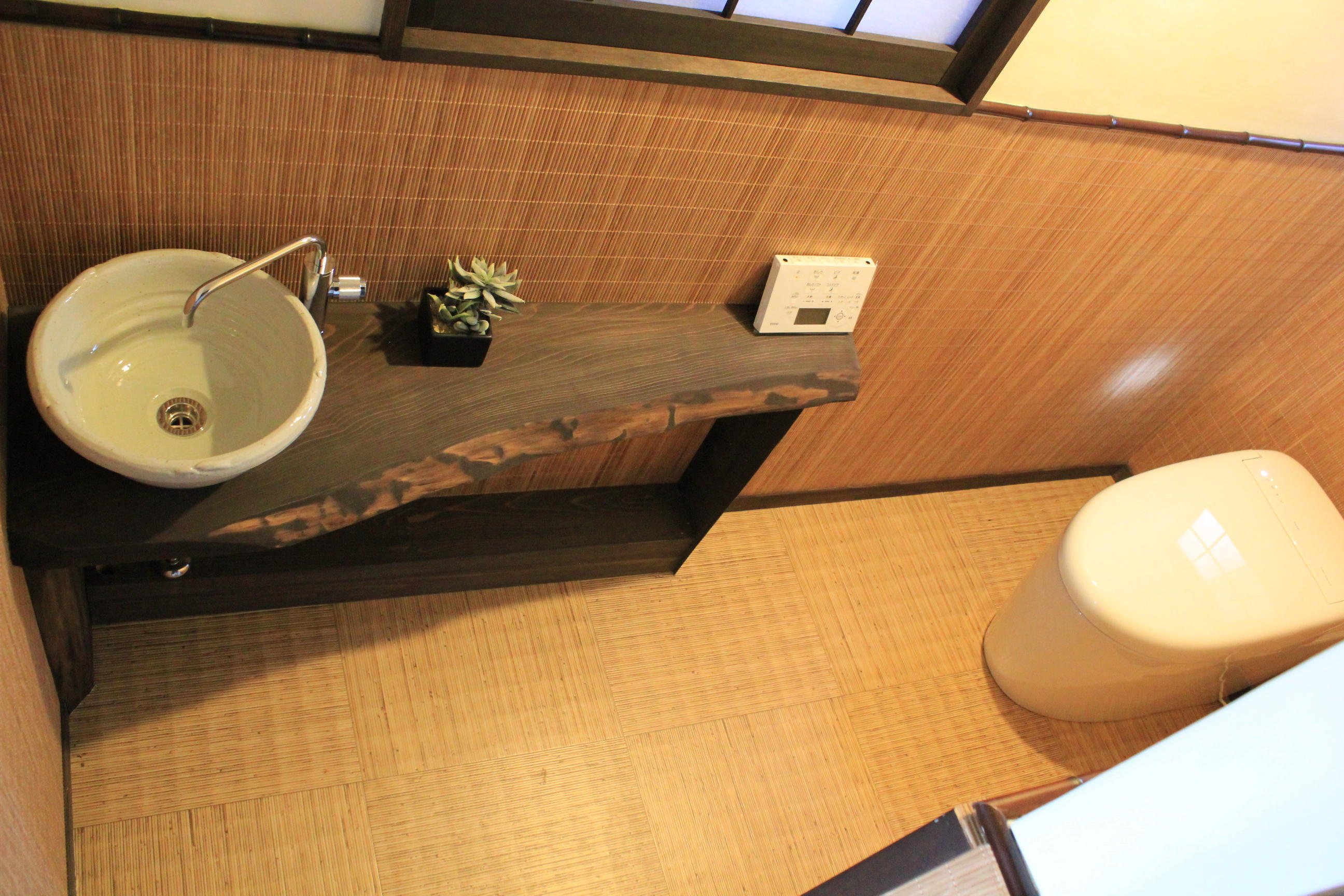 無垢板の手洗いカウンターを造作し、腰壁には琵琶湖産葭と竹を使用。床は、手入れをしやすいよう、竹柄のCFシートで仕上げました。足の悪いお母さまにも安心のバリアフリー設計です。