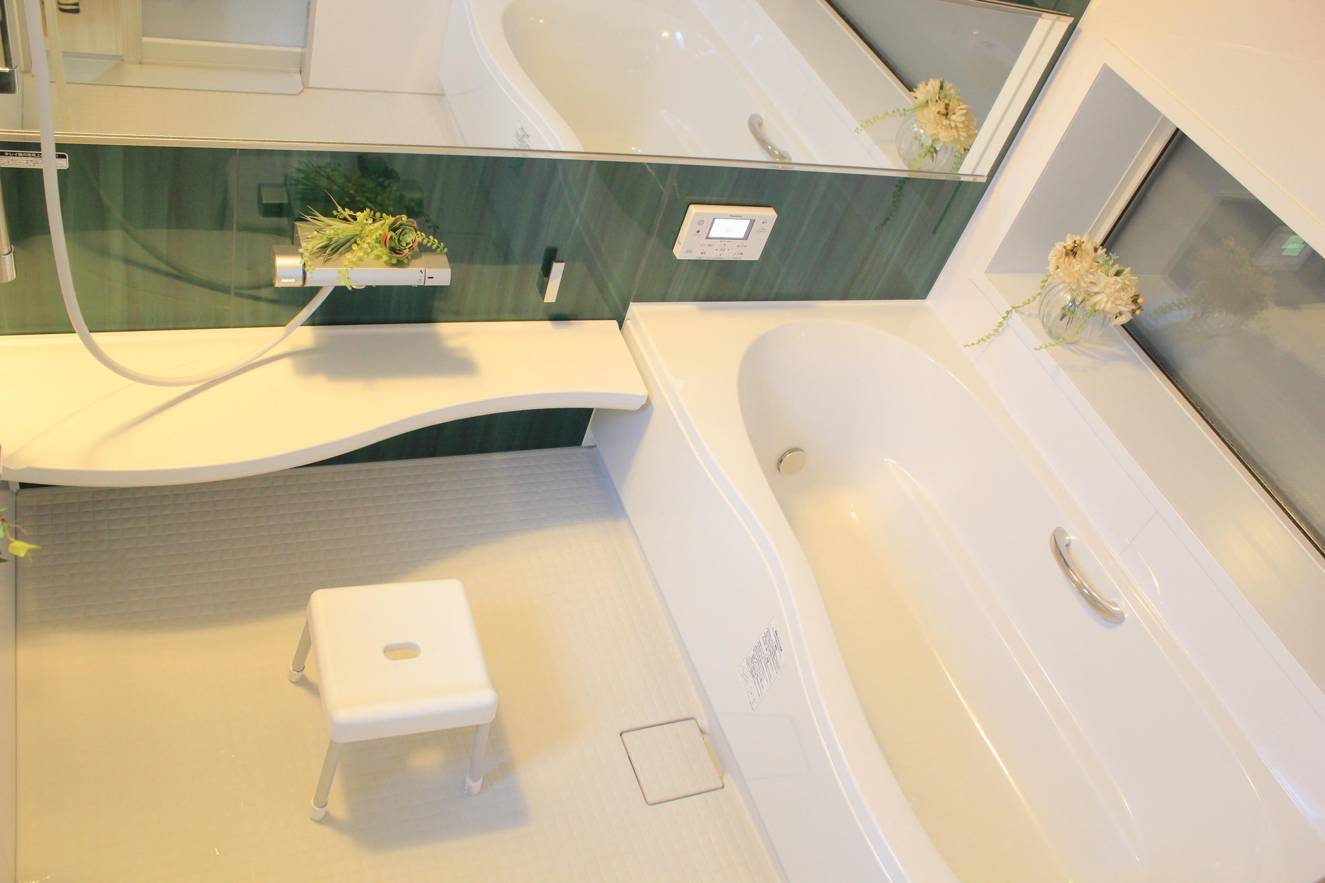 浴槽に浸かりながら、中庭を見ることができるよう、低い位置に窓を設けました。逆側には、風を通すための窓もあり、明るい浴室に仕上がりました。浴槽:LIXIL アライズ壁パネル【HN194】ボトルグリーン