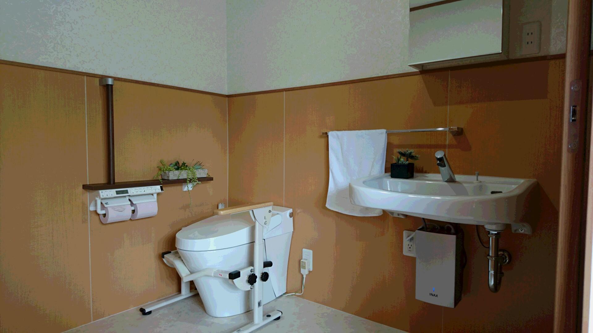 高齢のご両親が母屋までトイレに行くのが大変だからと、ご依頼頂きました。寝室の近くで、段差なく設置できるスペースを利用させていただき、車いすでも無理なく入れる広いトイレ空間が実現しました。普段の歯磨きや手洗いも近くなり、ご両親にも大変喜んでいただいているとのことで、私たちもうれしく思います。