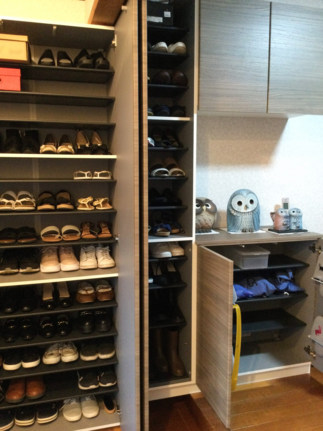 シューズケースに収まりきらない沢山の靴をどうにか1つの場所に収納して玄関をすっきりさせたい。とのご要望でした。