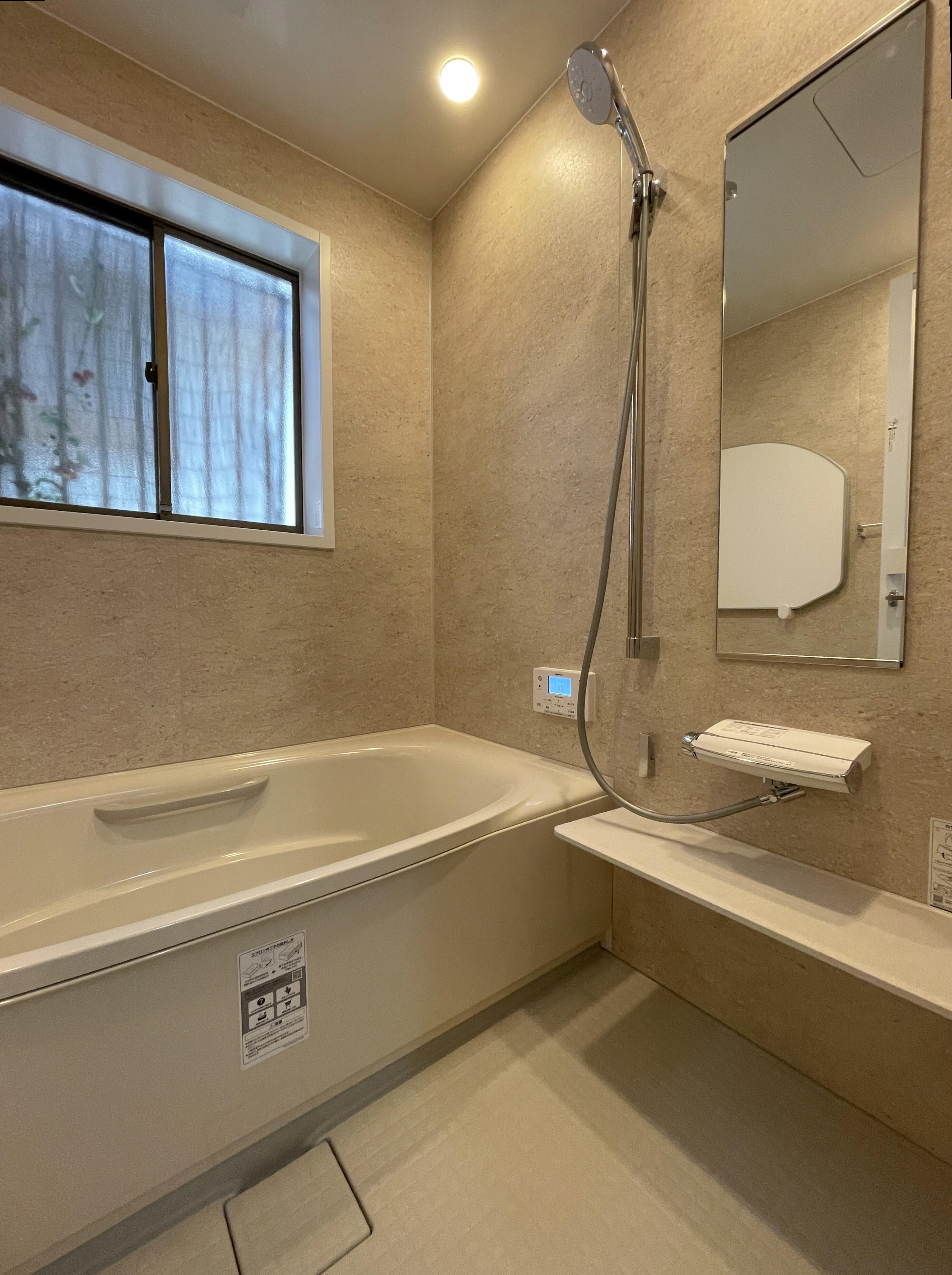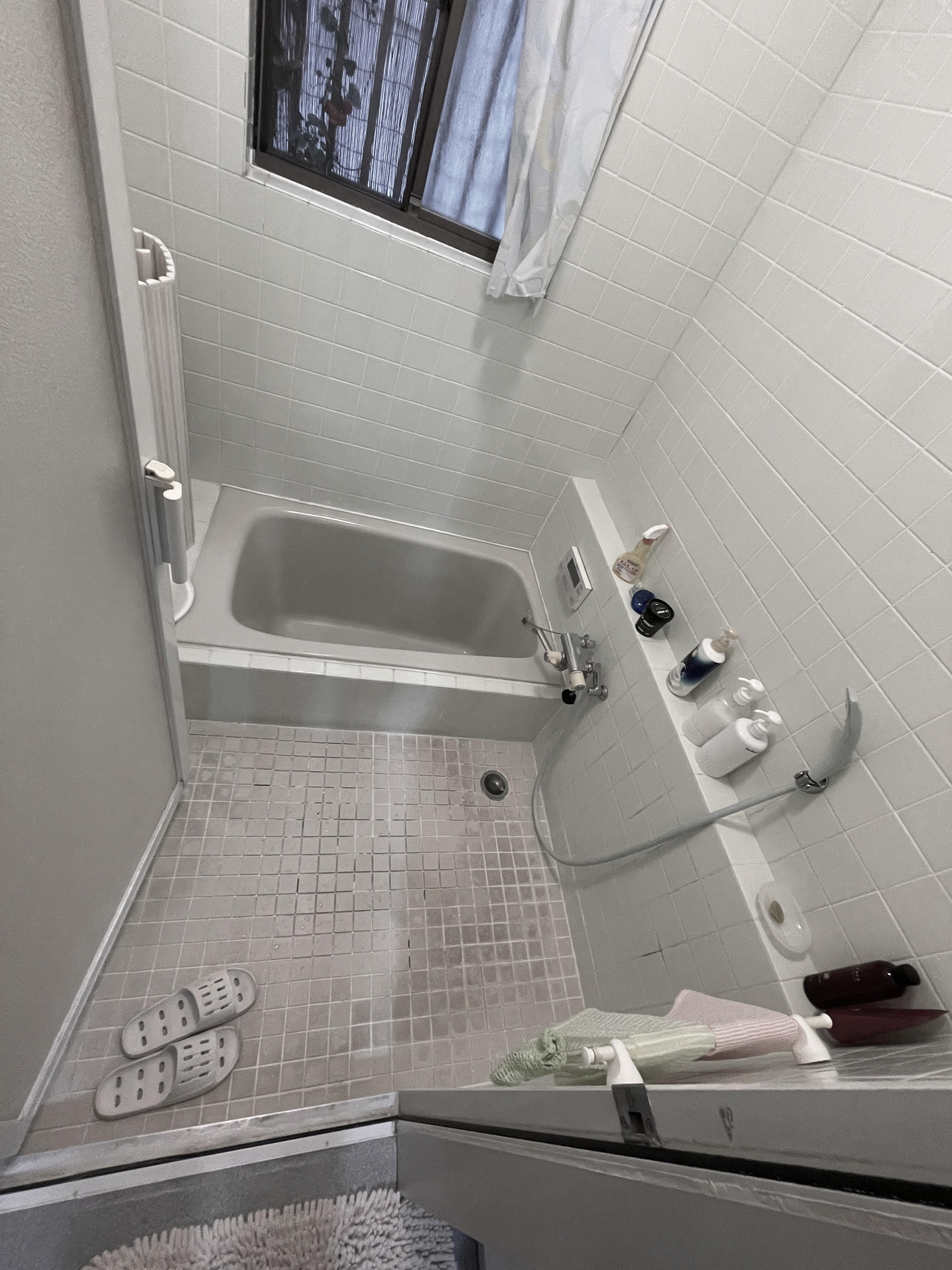 在来の浴室からシステムバスへのリフォームです。 お風呂に足を踏み入れた瞬間、ヒヤッと冷たさが堪えるタイルの床は、キレイサーモフロアを採用して、足裏から逃げる熱を少なくし、冷たさを感じにくくなりました。