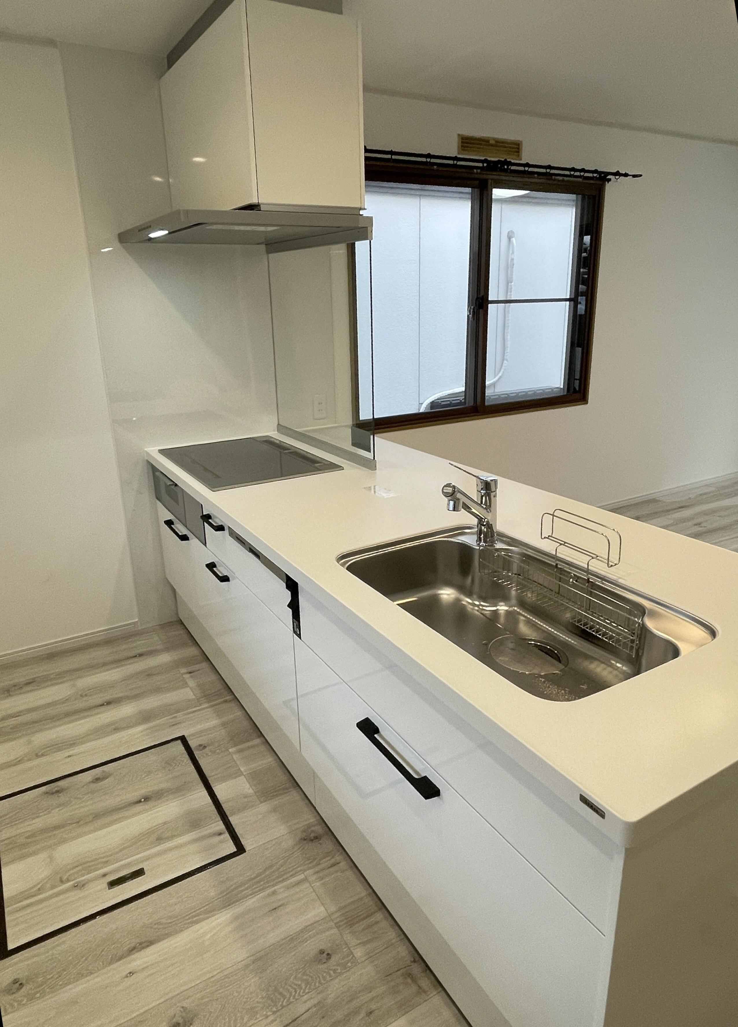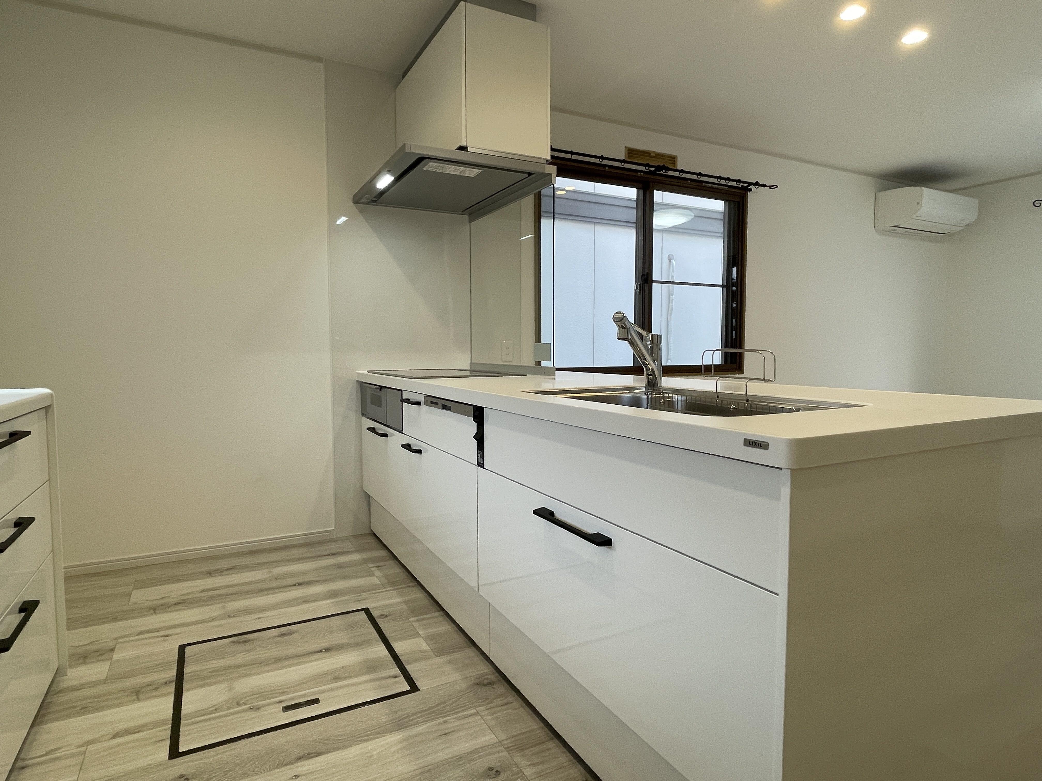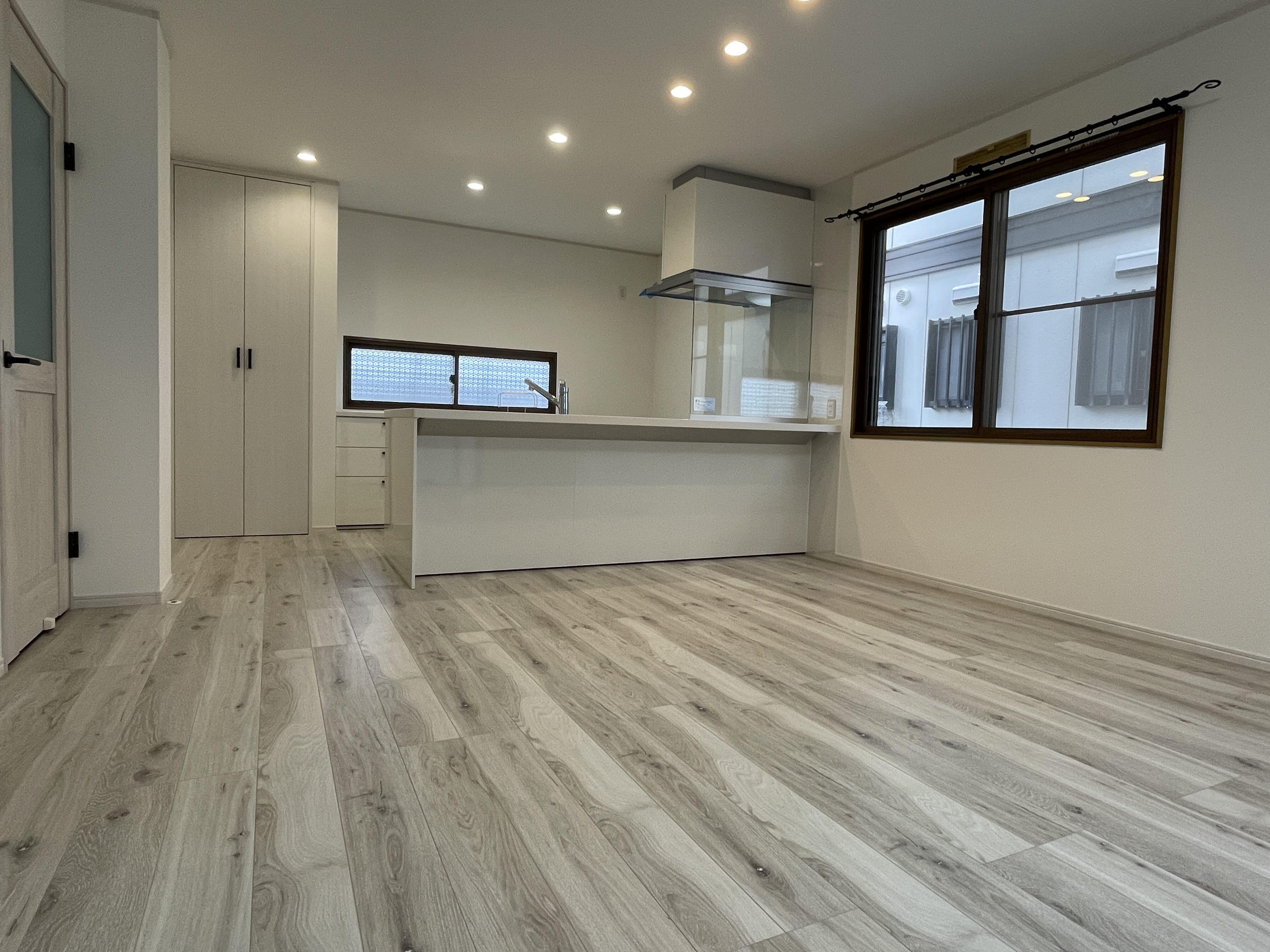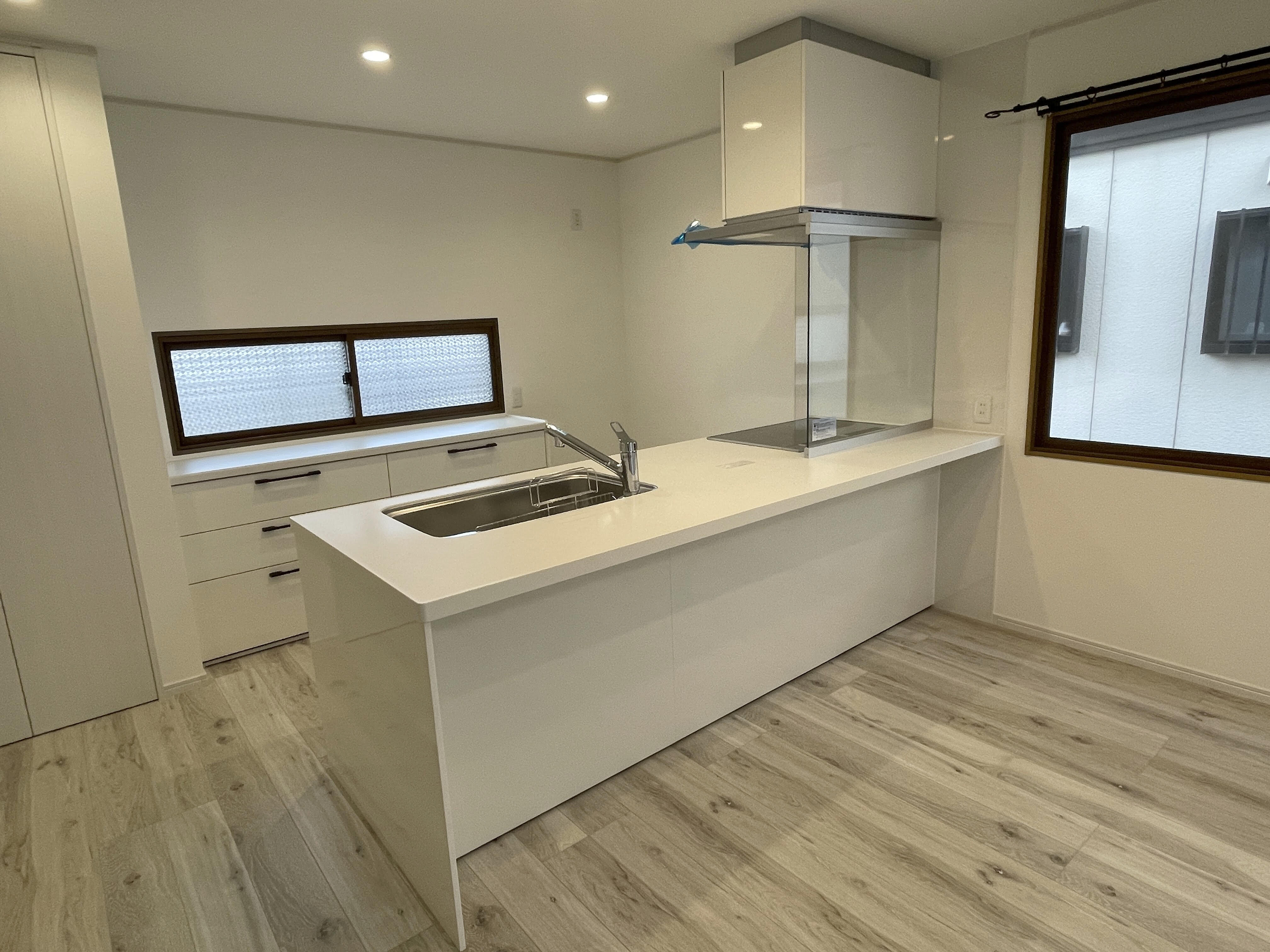 壁付けだったキッチンは対面式へ変更し、リビングダイニングを見渡せる開放的な空間に。白を基調とした内装で、ナチュラルで可愛らしい雰囲気に仕上がりました。