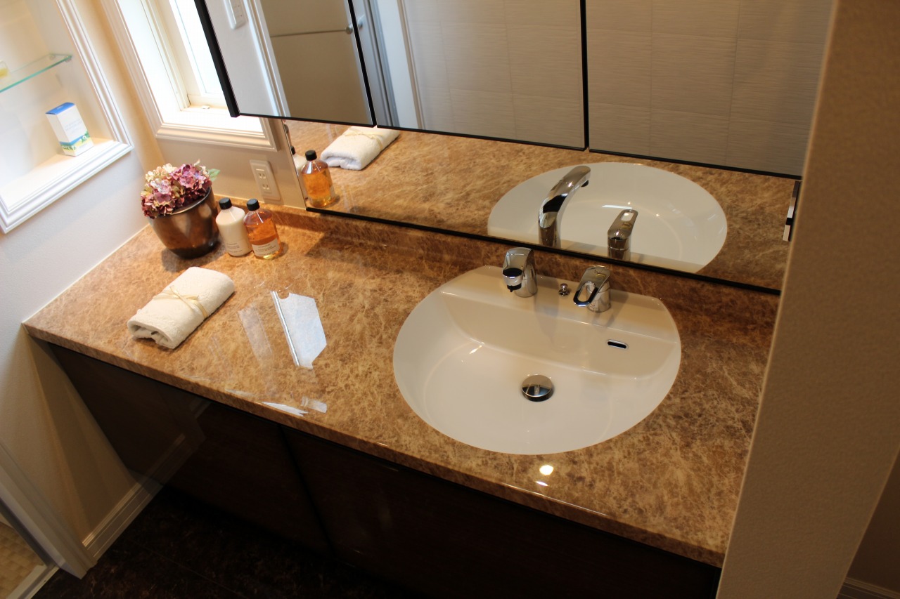 オーダー可能なルミシスの採用で、カウンターと三面鏡が壁から壁にスッキリ納まりました。