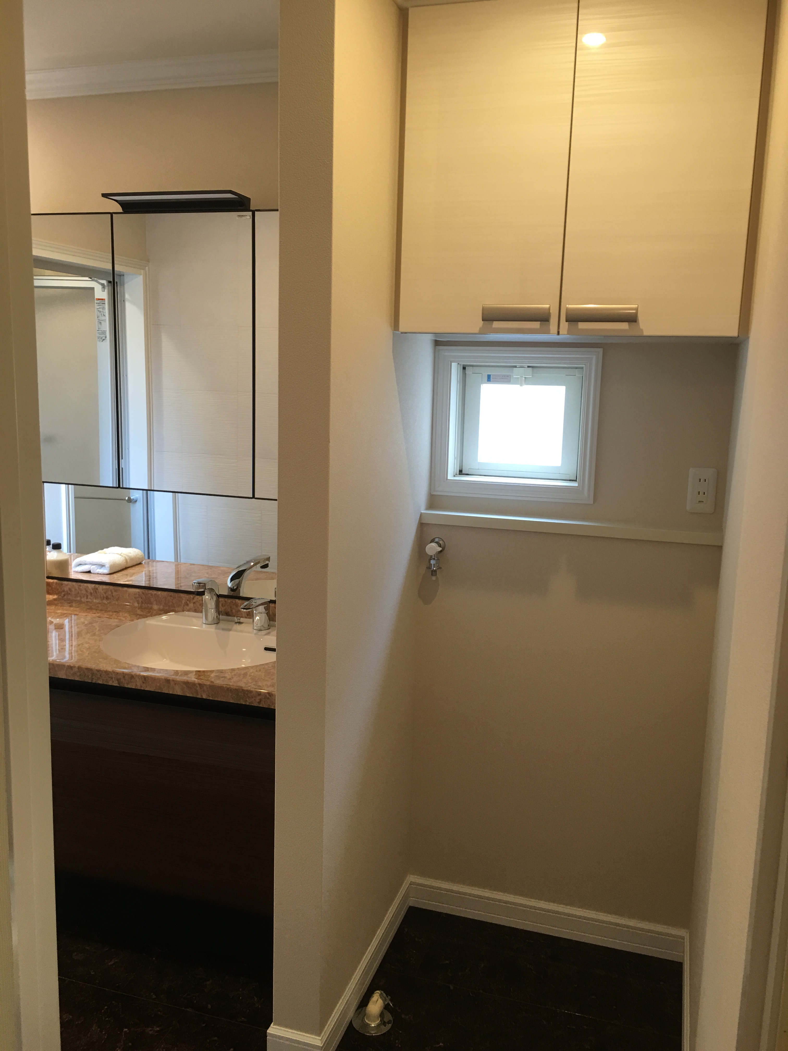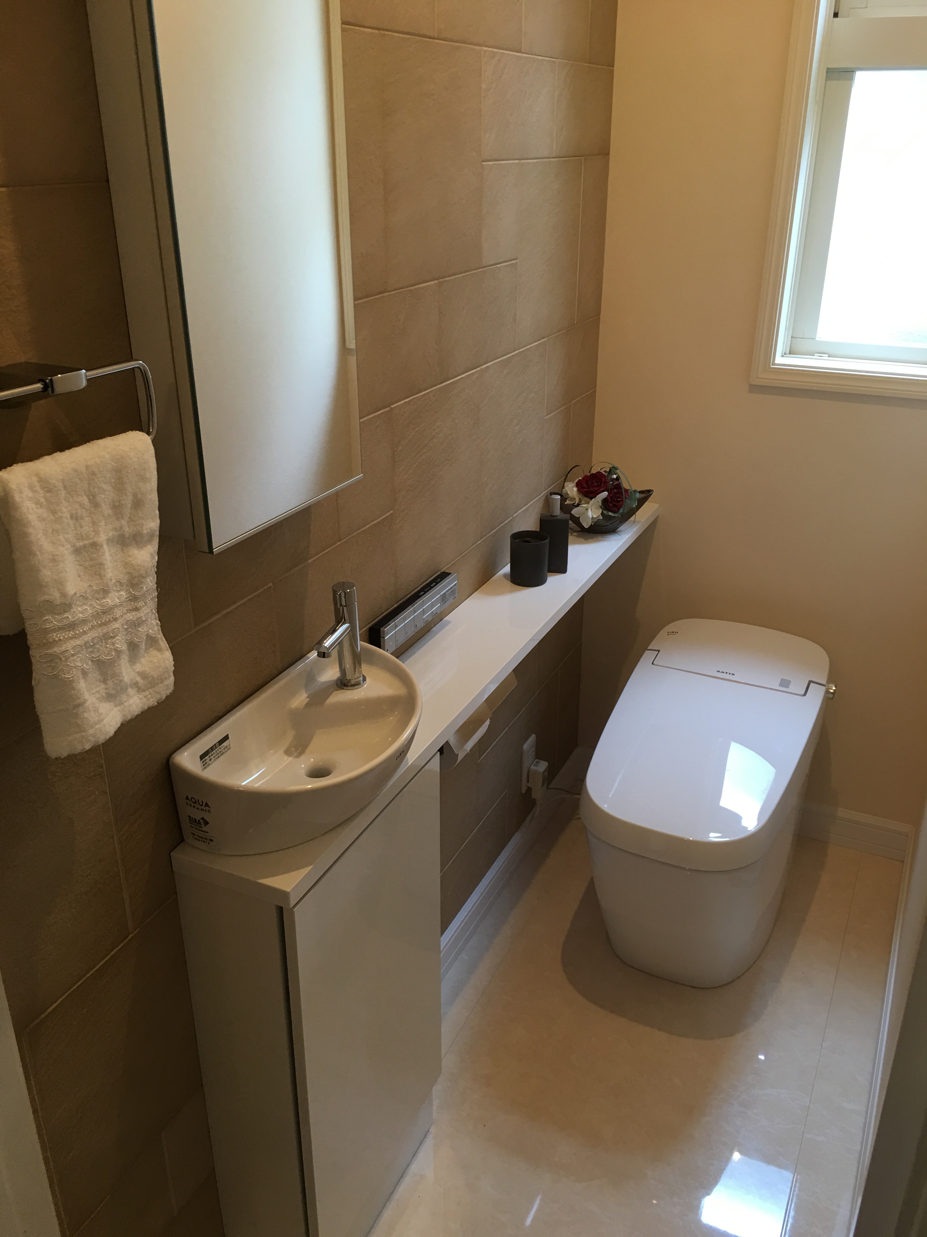 「予想以上の仕上がり!」とご家族で大満足いただけたトイレ空間。掃除用具や予備のペーパーの収納場所がなく不便な思いをされていましたが、間口は900。収納たっぷりのカウンターでは立つときに足が当たって窮屈とご主人様。そこで、奥行き160㎜の手洗いカウンター(下部収納付)キャパシアと埋込ミラー収納をご提案しました。収納したかった物が全て納まる収納スペースが増えたのに、空間は以前よりも広く感じると、とても喜んでいただきました。便器は最新型のLIXIL製サティスGで汚れが付きにくく、お手入れが楽々。タンクレスでスッキリです。壁のエコカッラトのデザイン、フロアの色など奥様と何度もショールームで打合せをさせて頂き、とても素敵な仕上がりになりました。